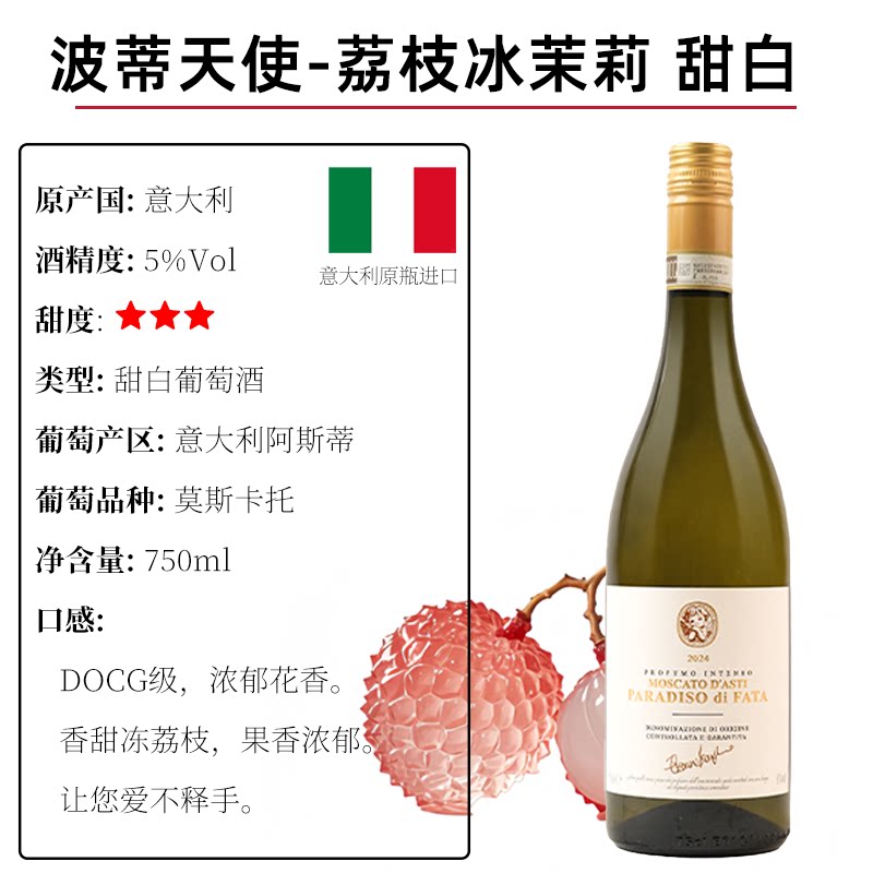 意大利原瓶进口 波蒂天使荔枝冰茉莉甜白果酒莫斯卡托白葡萄酒