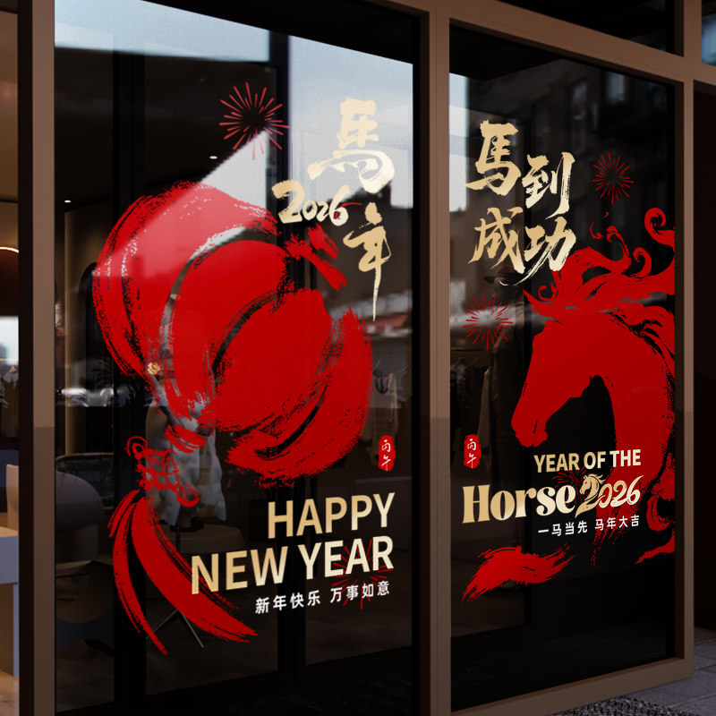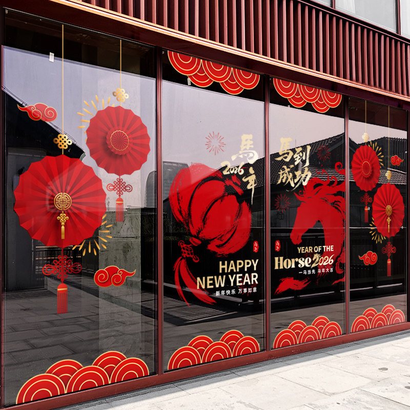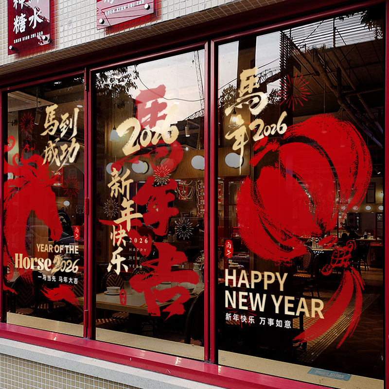 新年装饰窗花马年中式贴画春节过年静电贴2026橱窗布置玻璃门贴纸