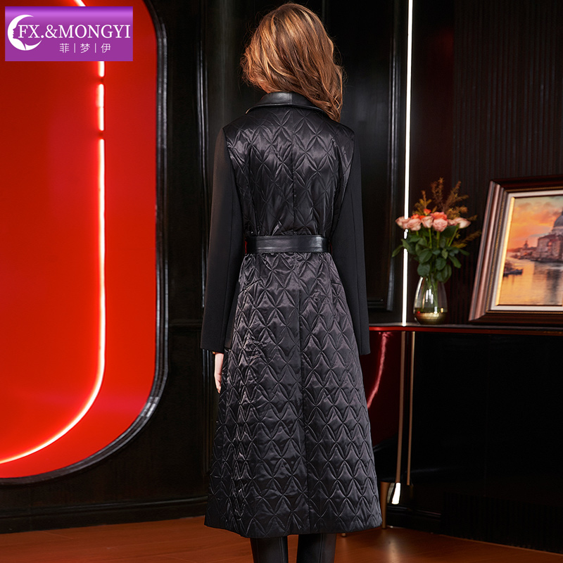 菲梦伊黑色真皮西装领风衣外套女秋冬季高级感收腰中长款皮衣大衣
