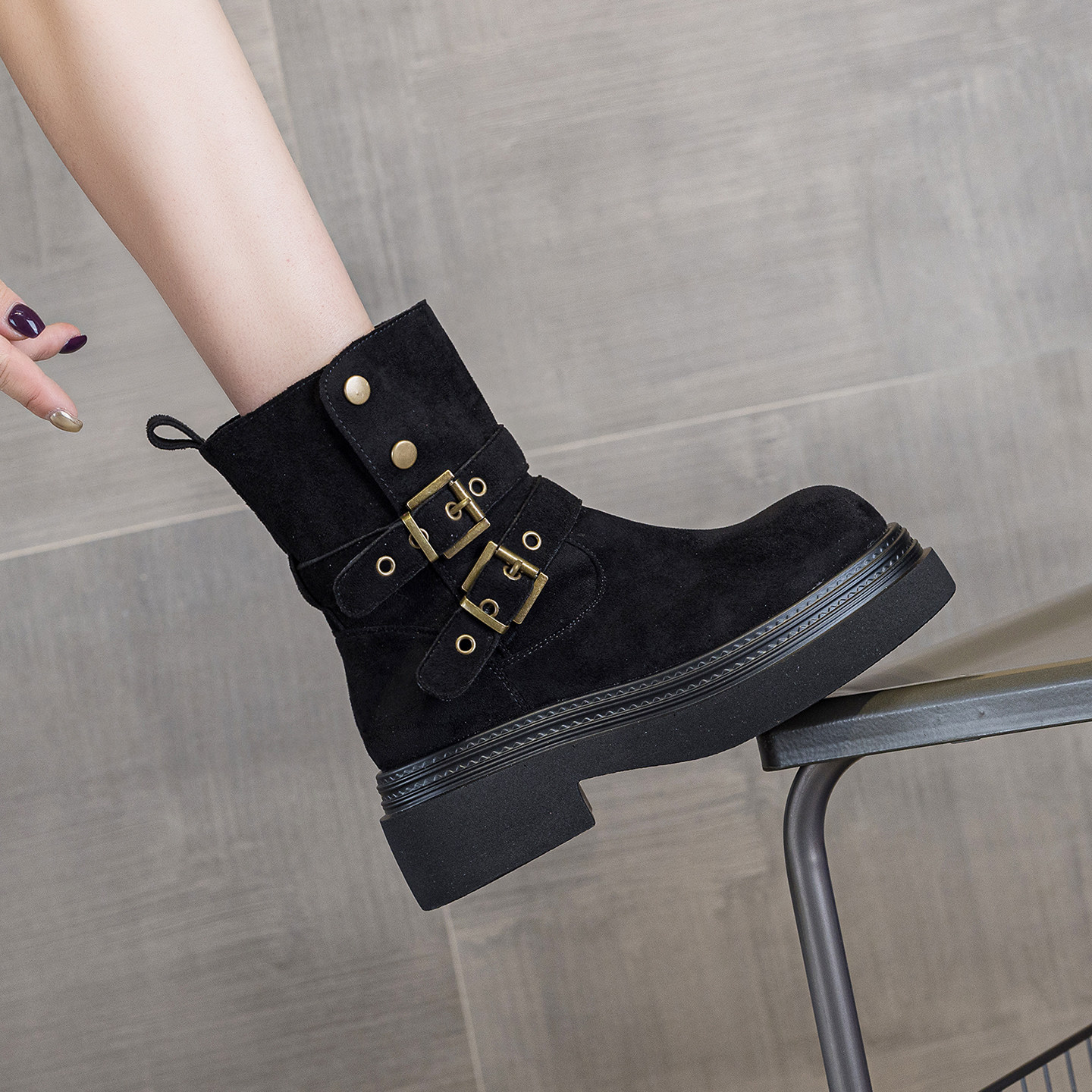 英伦风厚底马丁靴女2025年新款中筒靴皮带扣磨砂绒面加绒平底短靴