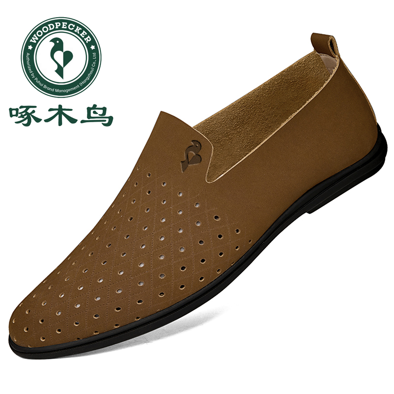 啄木鸟夏季男鞋正品新款单层皮鞋男真皮透气镂空休闲一脚蹬豆豆鞋