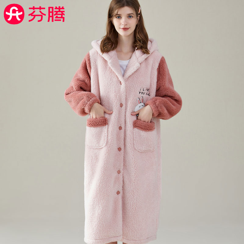 芬腾秋冬新款加厚珊瑚绒睡裙女士甜美连帽保暖可爱浴袍睡袍家居服