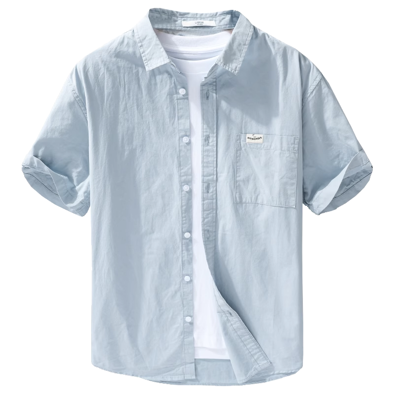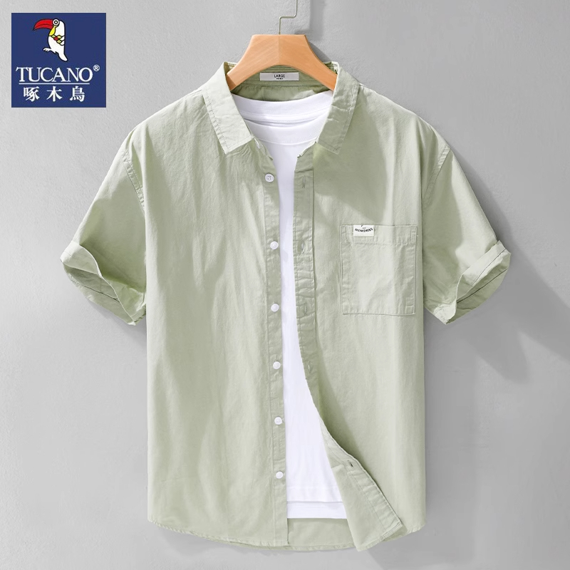 啄木鸟男士纯棉短袖衬衫夏季薄款日系休闲潮流衬衣纯色百搭上衣服