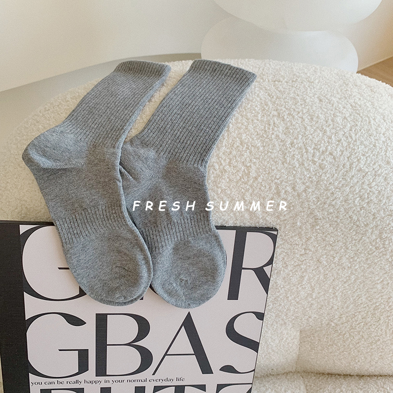 2双装~纯色收腰中筒袜黑白色运动百搭袜子女纯棉薄款春夏透气长袜