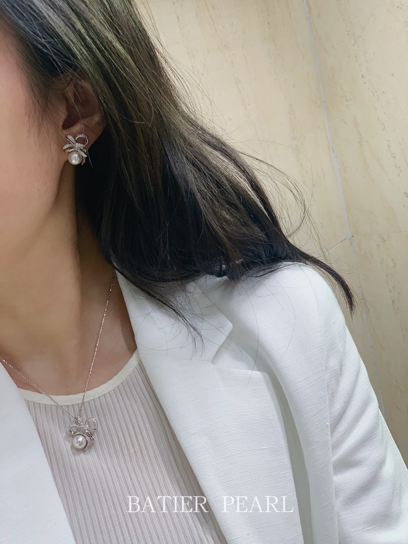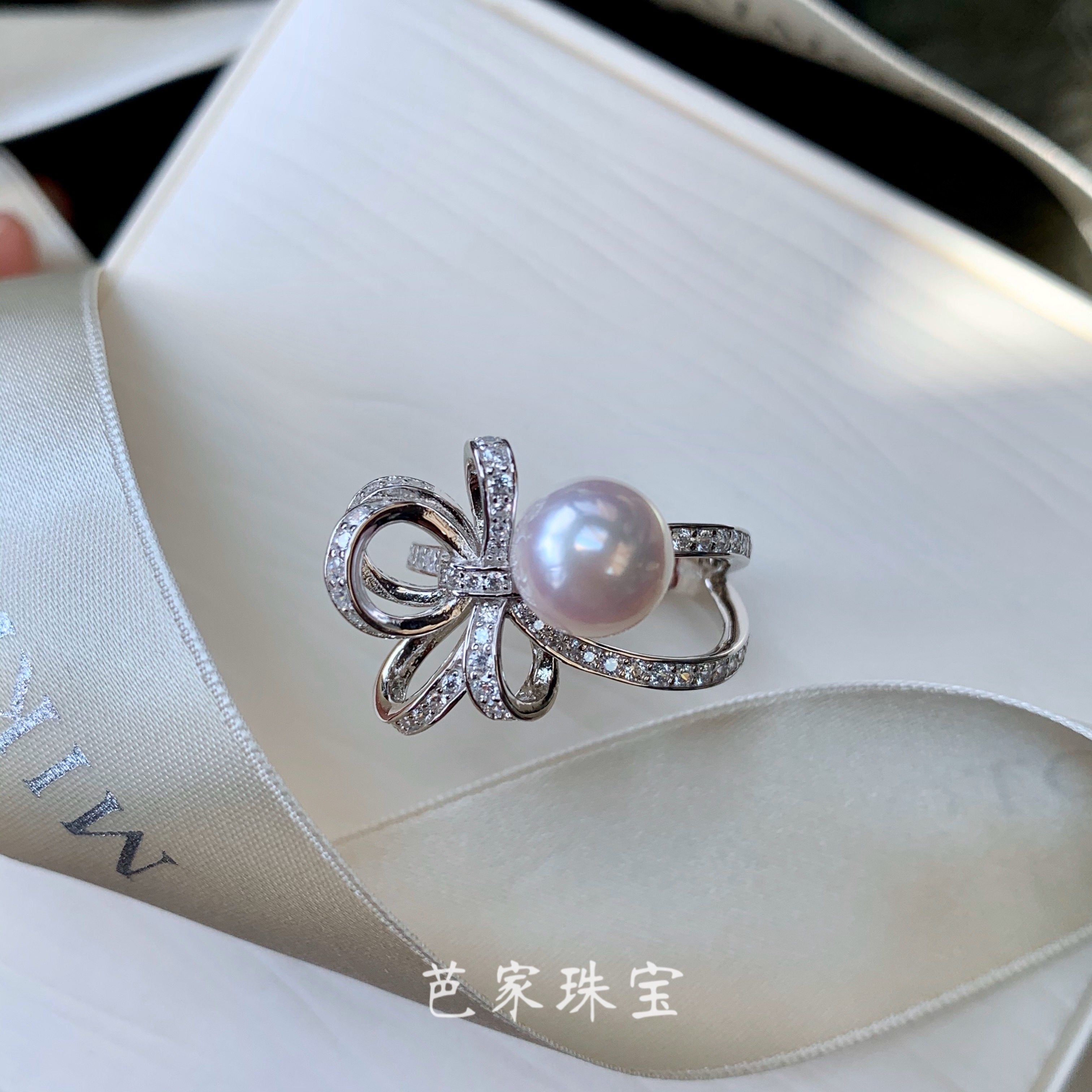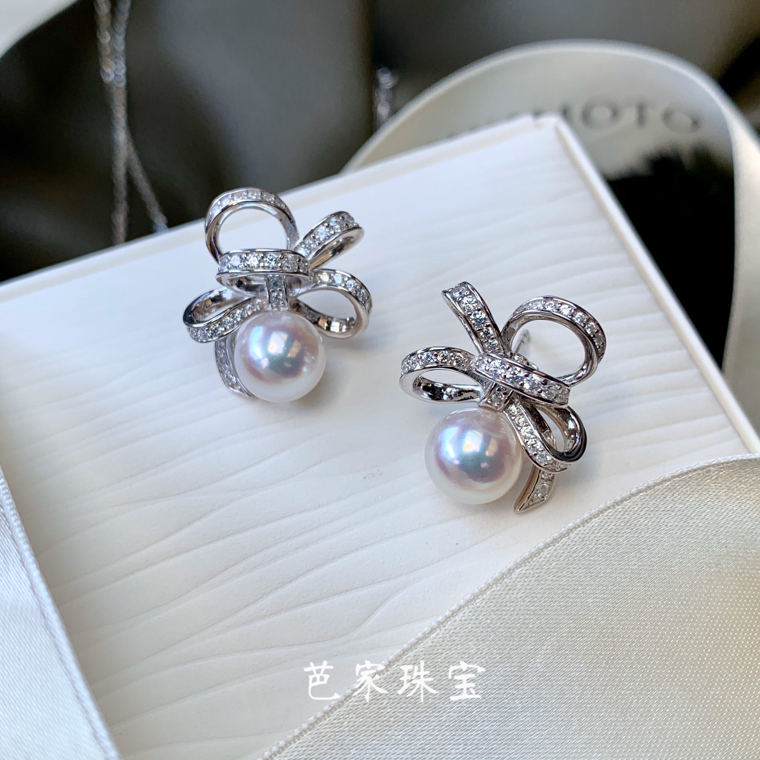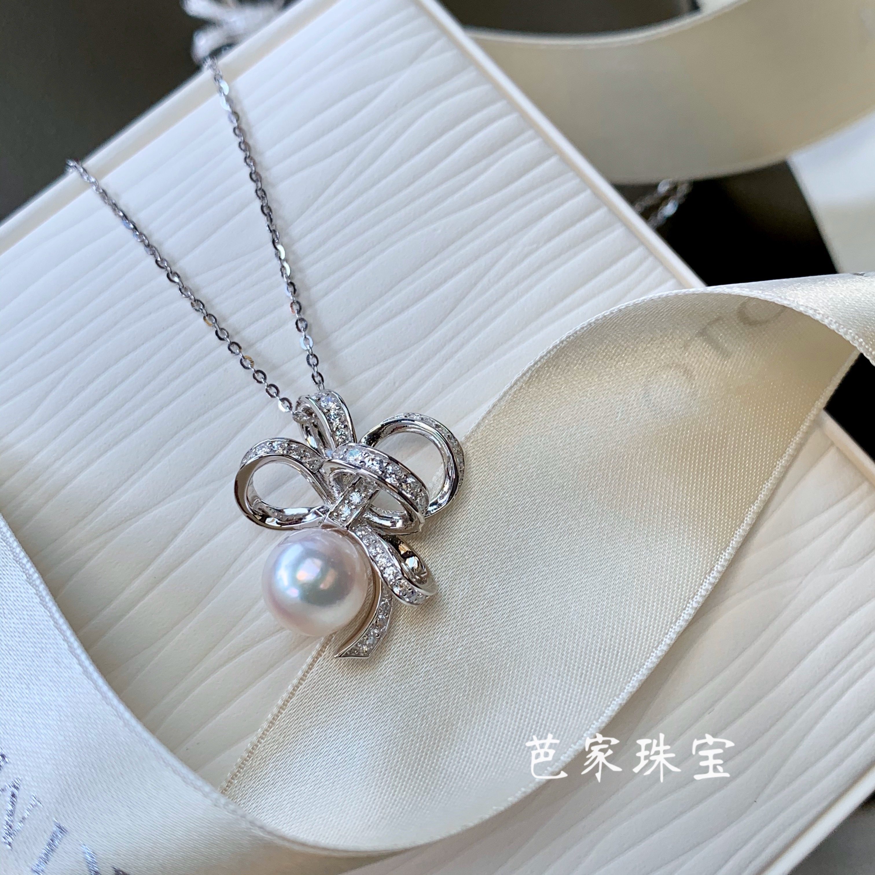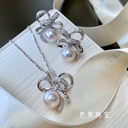 芭家珠宝 缎带之舞 日本akoya海水珍珠925纯银耳钉项链戒指套装