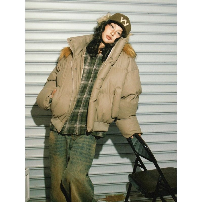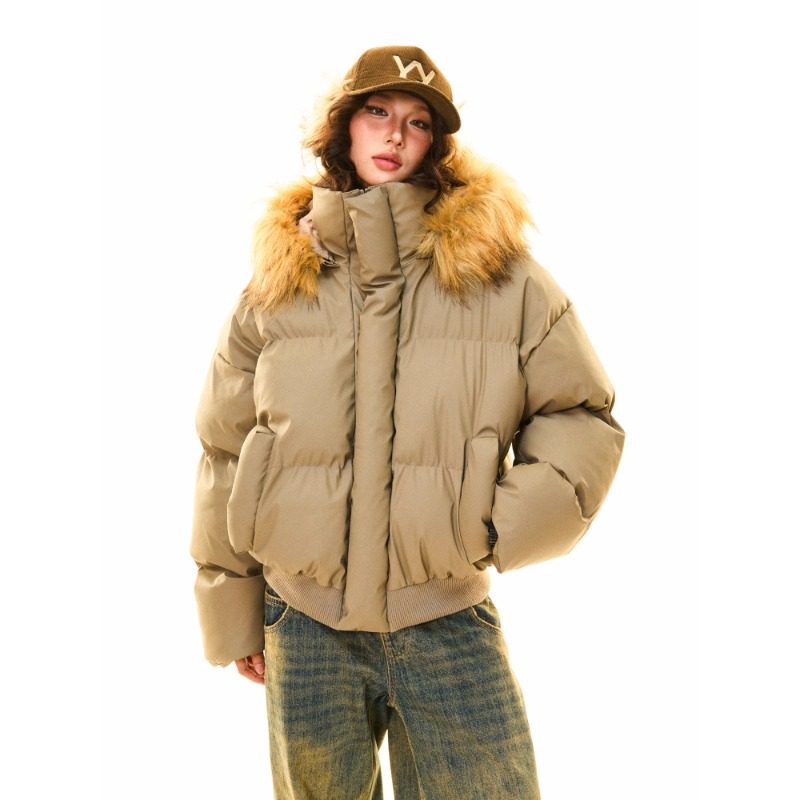 美式高街毛领连帽短款pu皮棉服女冬季cleanfit面包服加厚外套棉衣