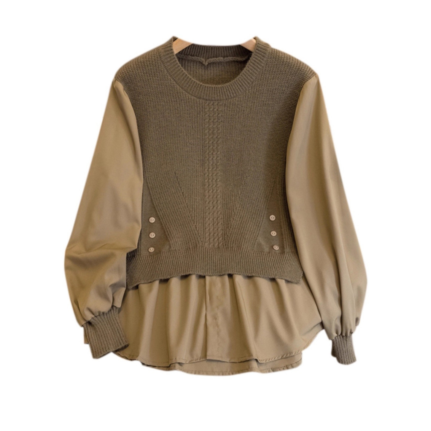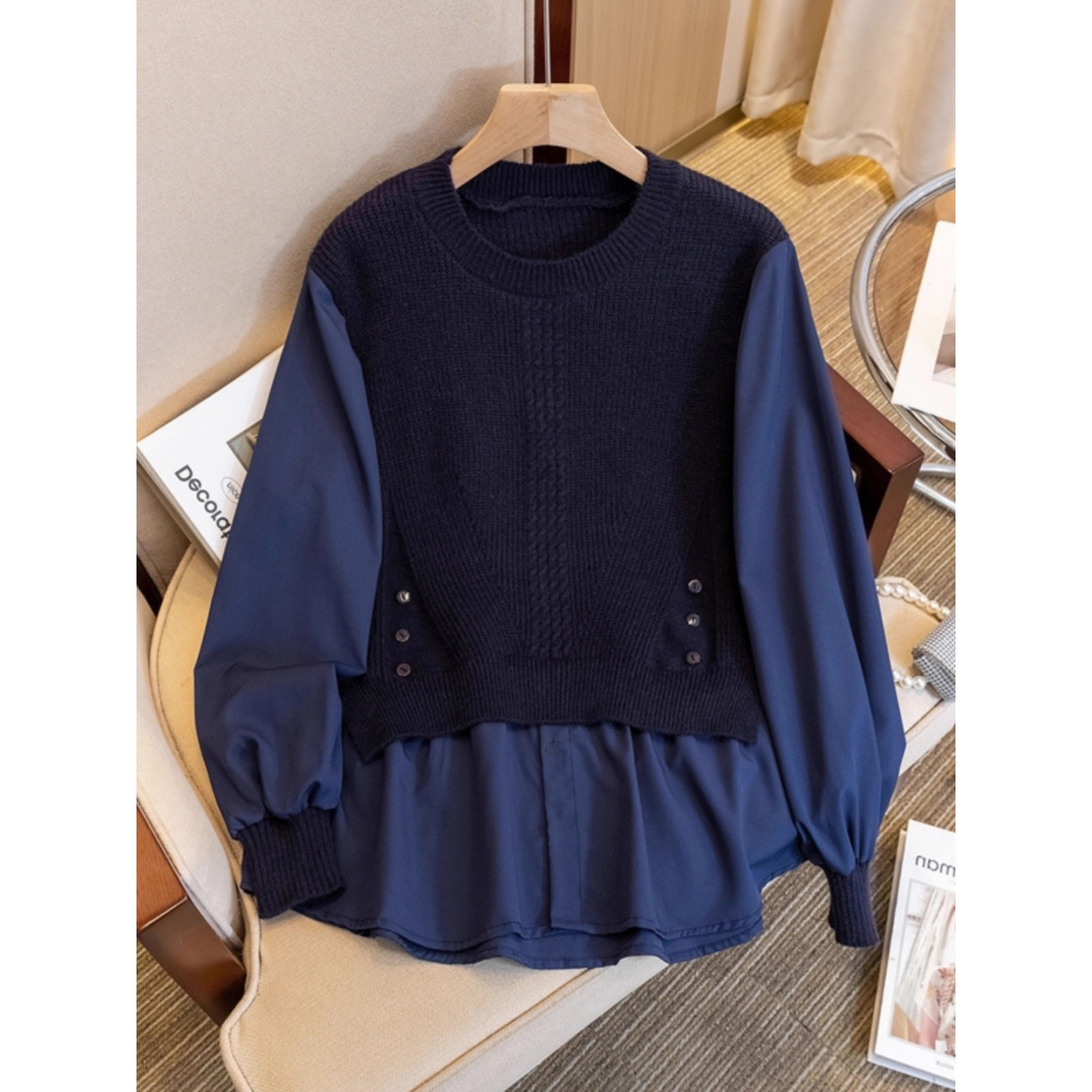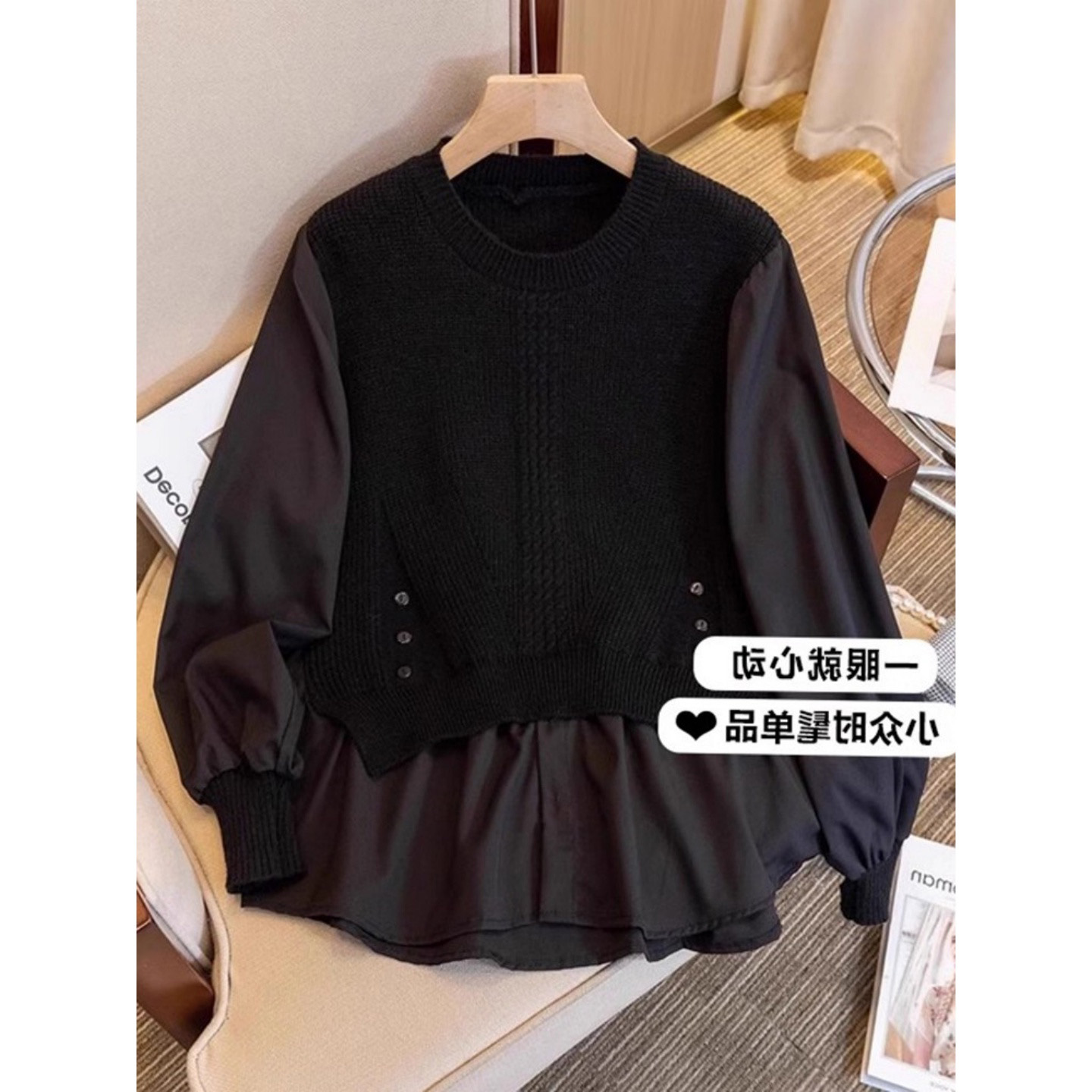 300斤大码假两件长袖衬衫女胖MM宽松遮肉休闲显瘦百搭针织衫毛衣