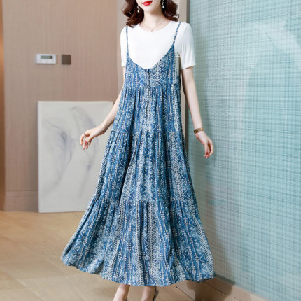 夏季小碎花吊带连衣裙女夏套装外穿及踝两件套长款长裙棉麻吊带裙