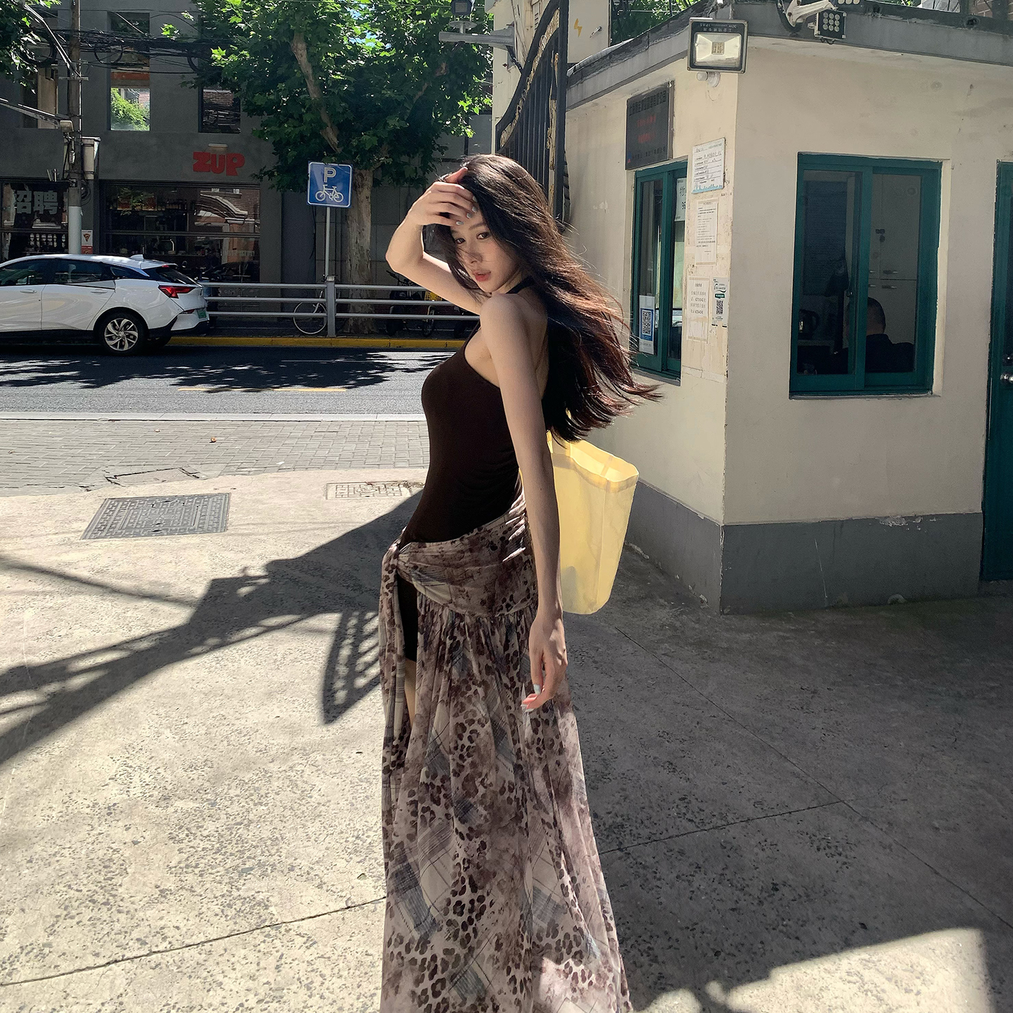 Lienni2025夏季新款高腰显瘦辣妹褶皱拼接豹纹挂脖长款连衣裙女