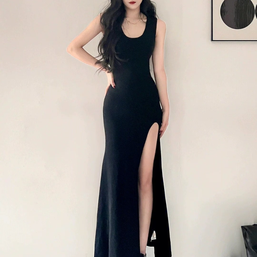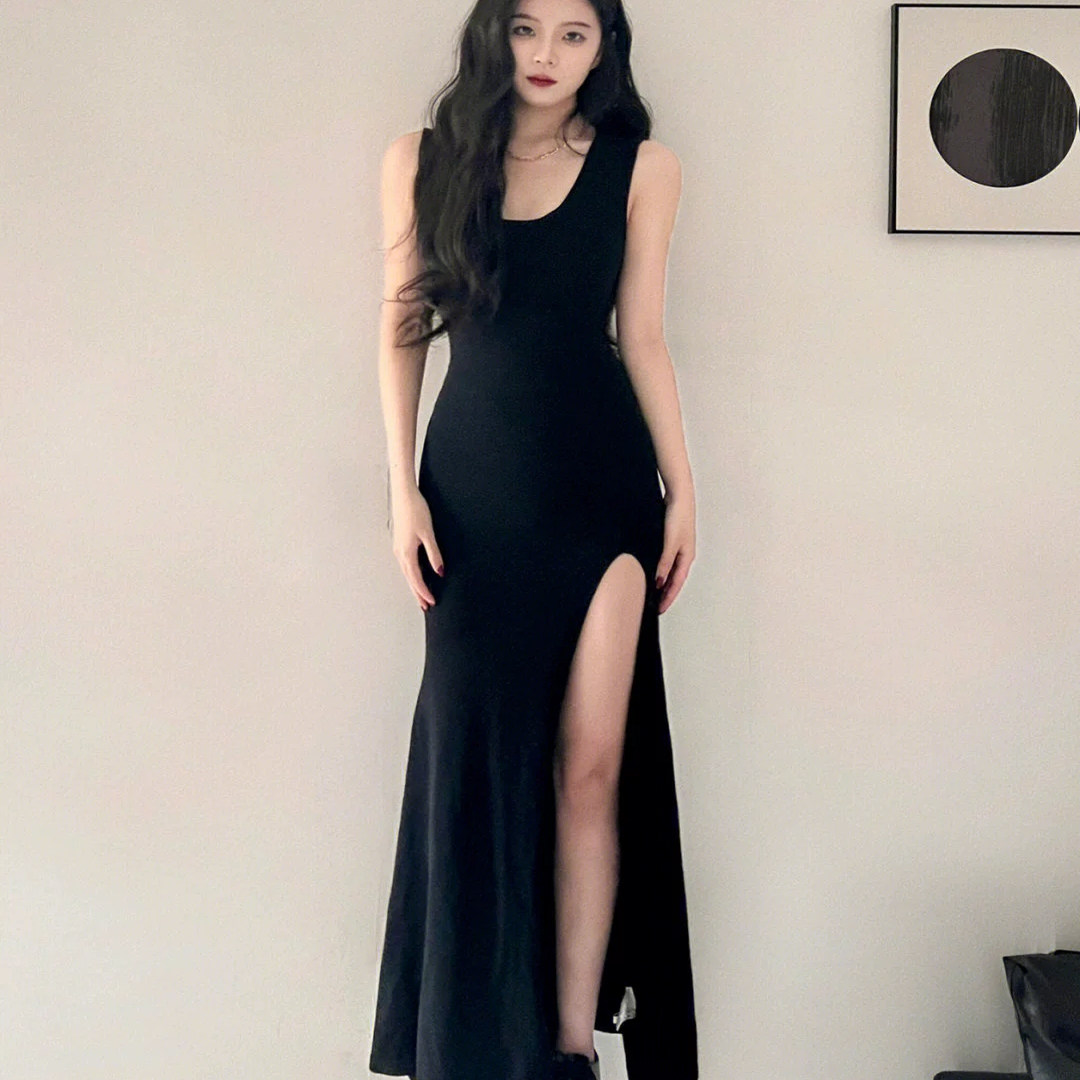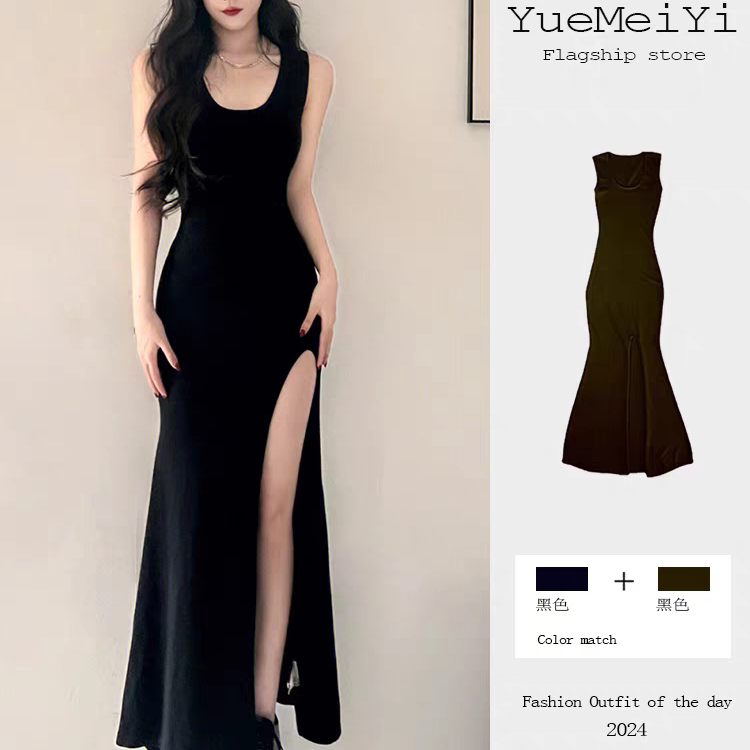 黑色u领法式连衣裙女夏高级感莫代尔大码显瘦背心裙修身吊带长裙
