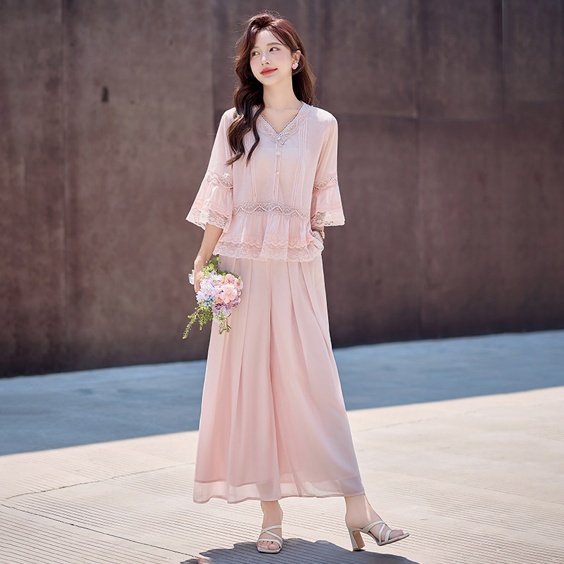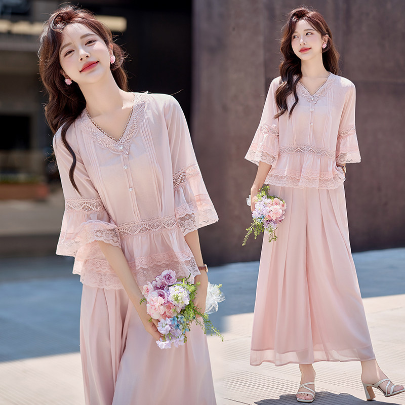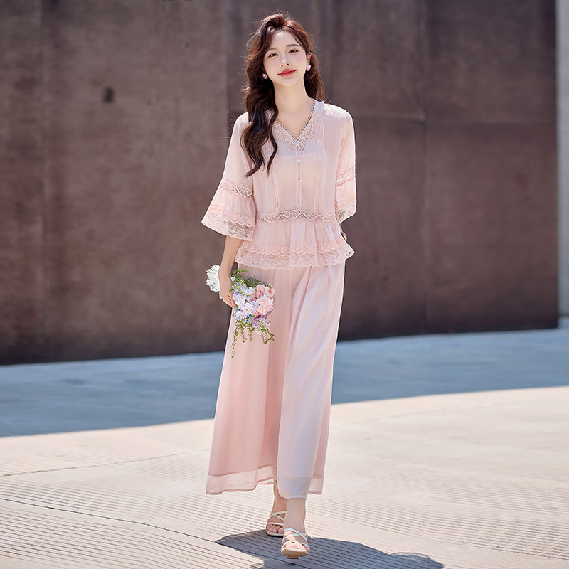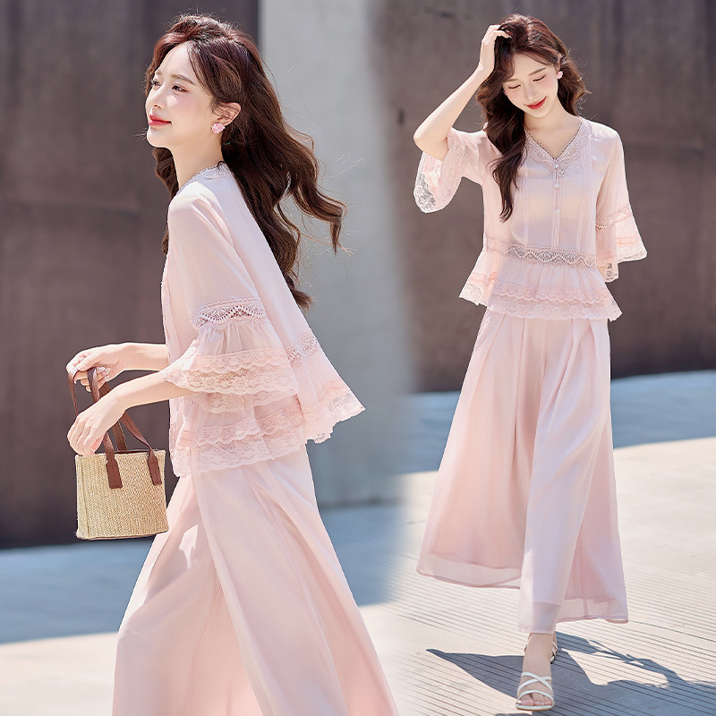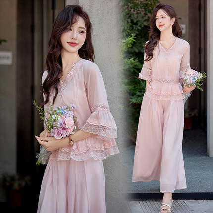 小香风套装女夏高级感韩版时尚气质洋气减龄显瘦蕾丝阔腿裤两件套