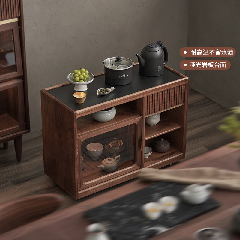 实木沙发边几侧边柜可移动茶水柜黑胡桃木置物柜岩板茶几储物边柜