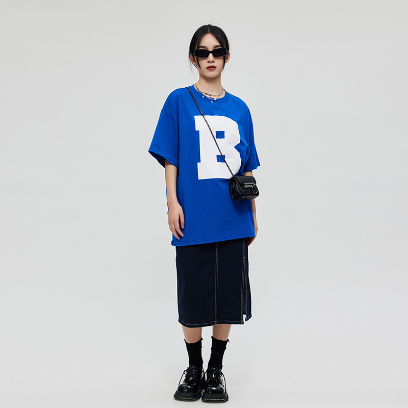ZUOBEIKA潮牌宝蓝色T恤女短袖字母印花纯棉甜酷复古美式半袖体恤