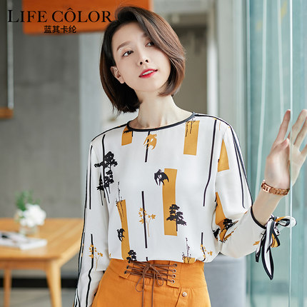 100桑蚕丝春夏简约宽松真丝衬衣时尚印花圆领套头长袖衬衫女