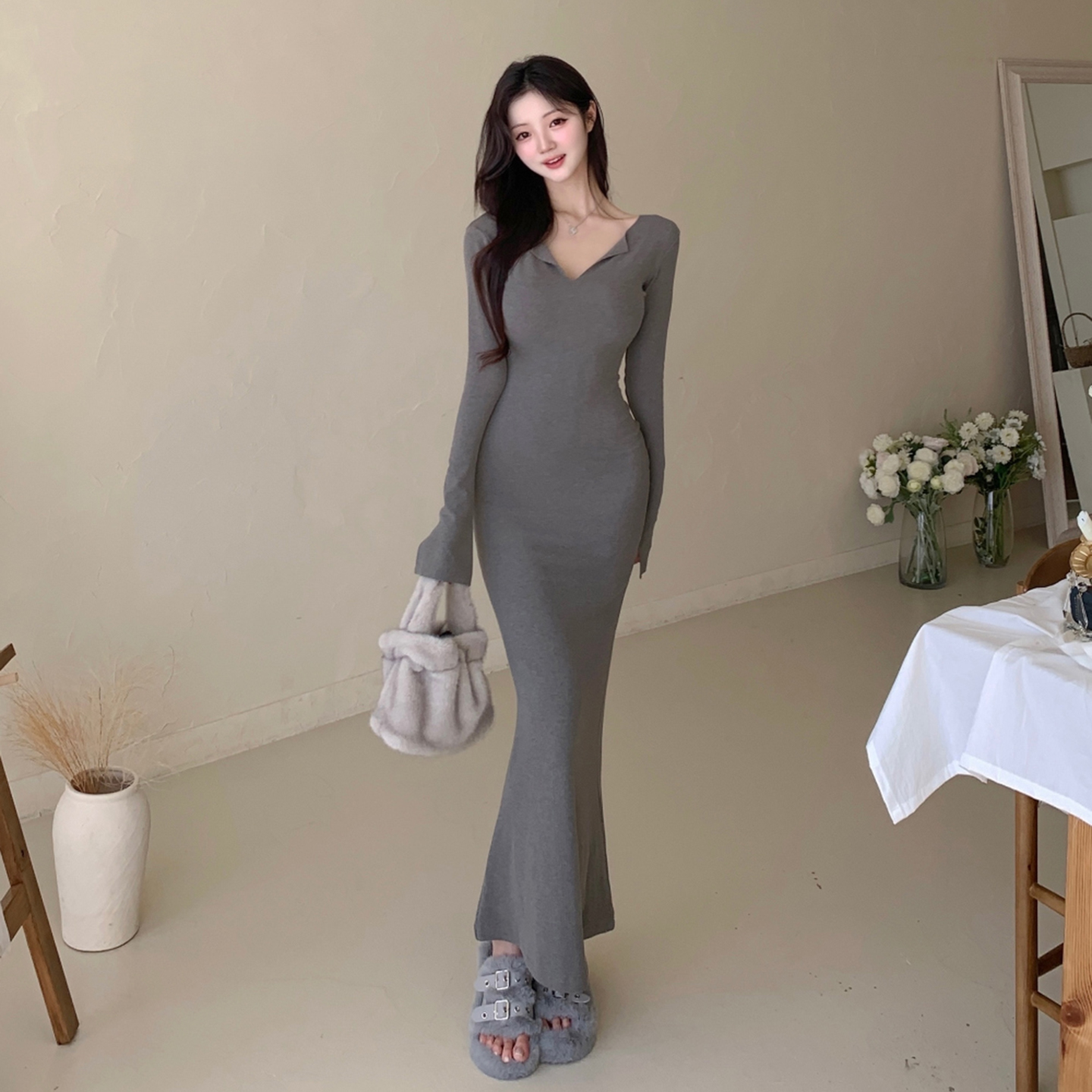 HEYOUNGIRL韩系纯欲V领纯色长袖连衣裙气质修身显瘦包臀鱼尾长裙