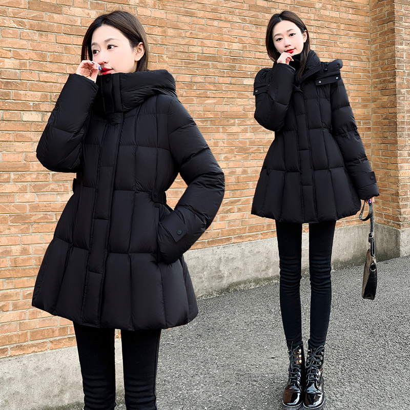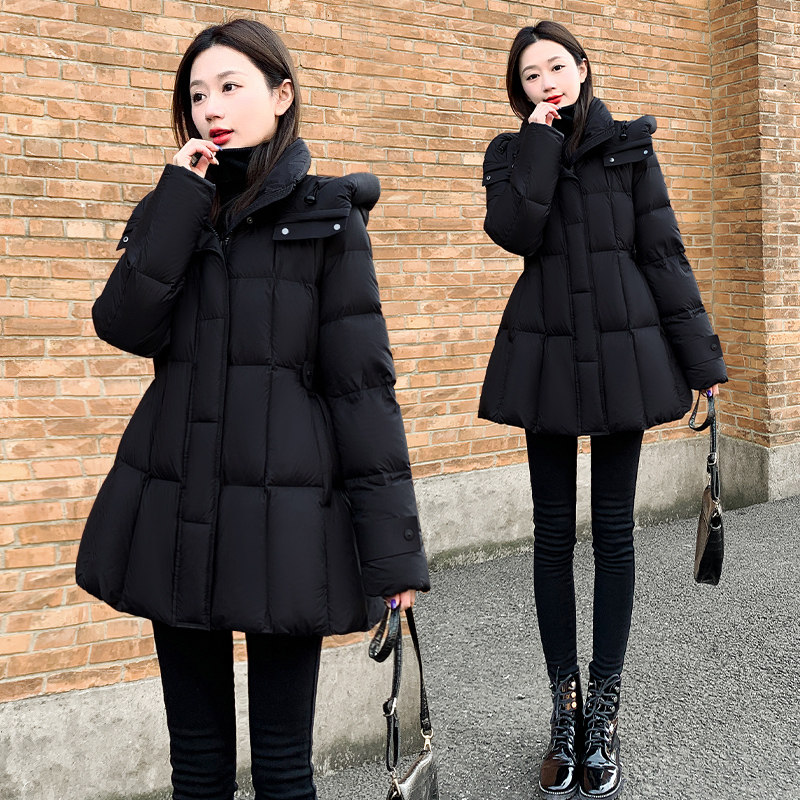 小个子黑色连帽鸭绒外套2025新款女装冬季修身收腰中长款羽绒服女