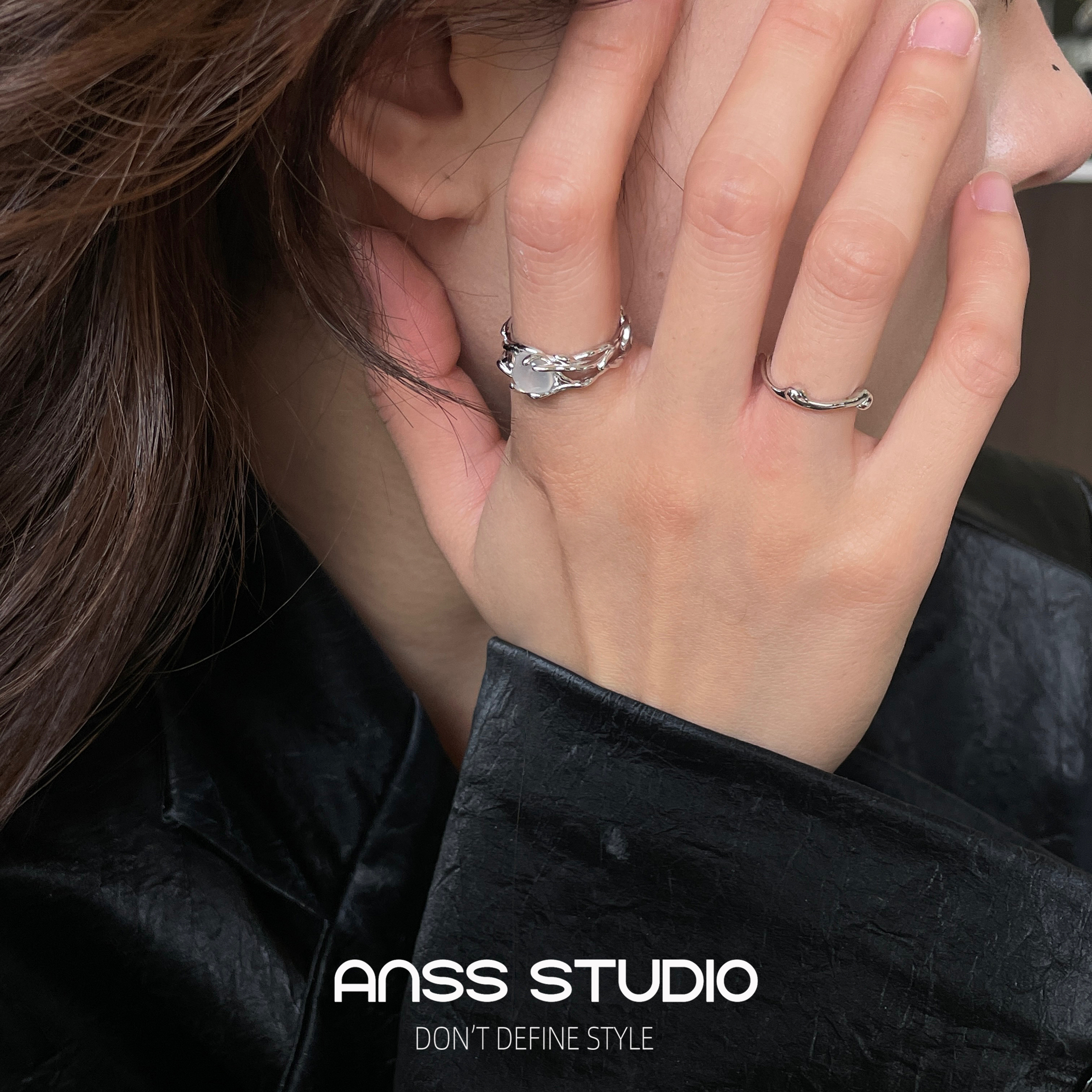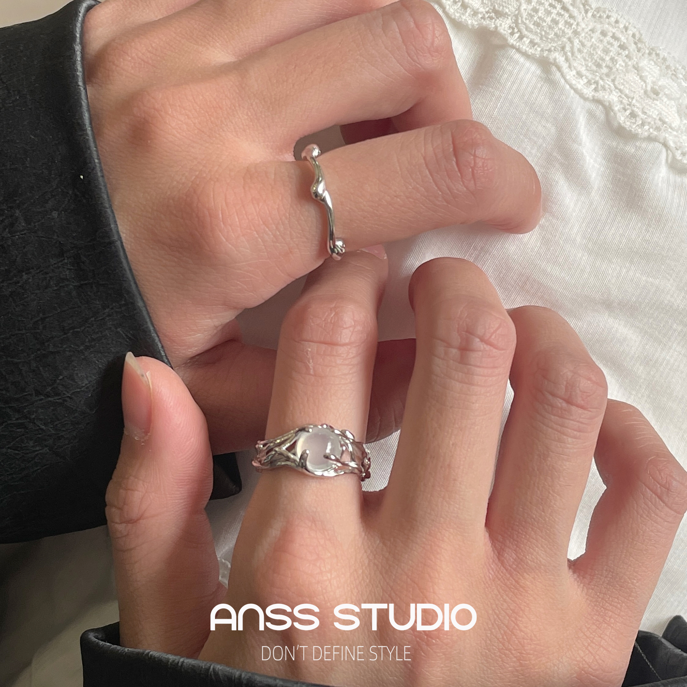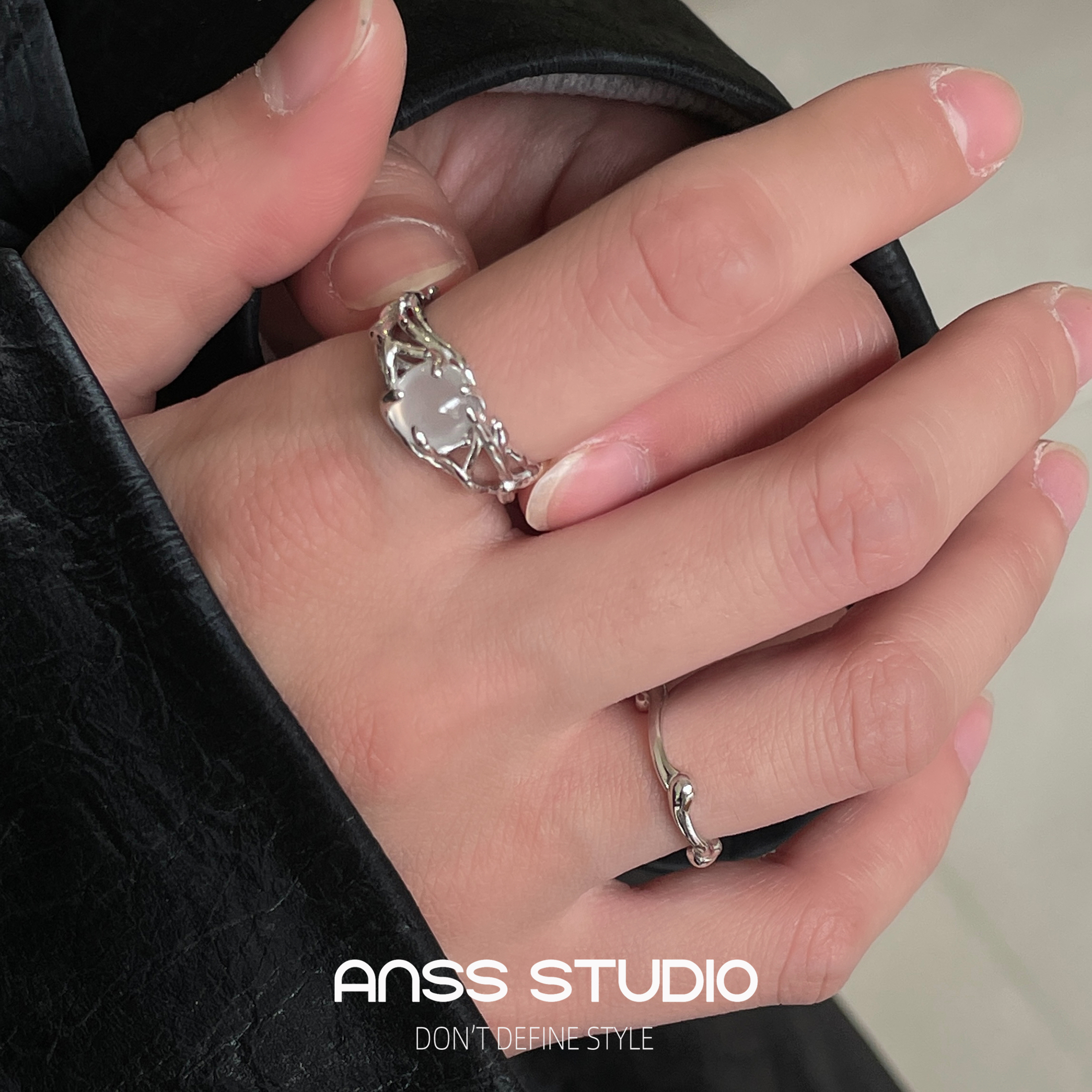 【ANSS】925纯银 质感异形镂空设计镶嵌白玛瑙开口戒指女百搭指环