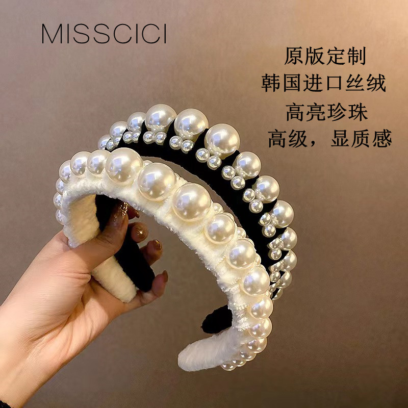高颅顶珍珠发箍郑秀妍明星同款头箍2024新款时尚洋气丝绒防滑发卡