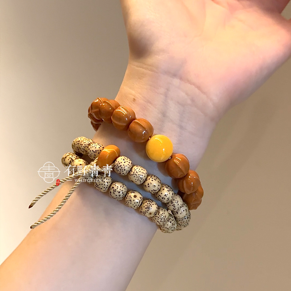 有野青青「星无眠」原创中式星月菩提老型双圈蜜蜡饼子文玩手串
