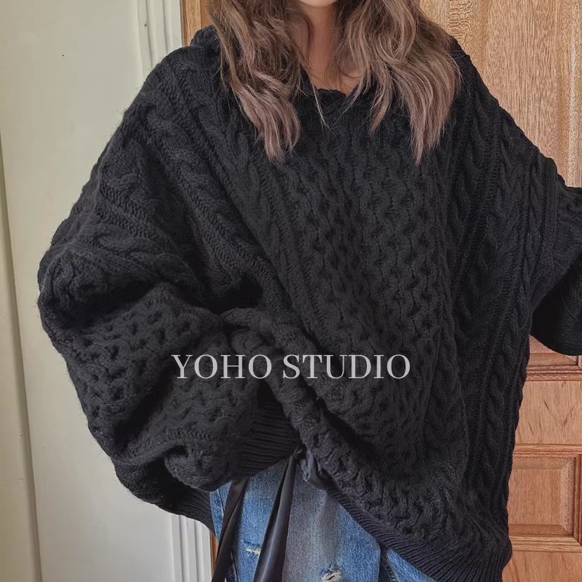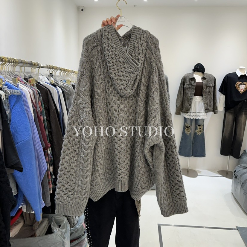 韩国东大门女连帽麻花辫宽松中长款长袖针织衫毛衣外套