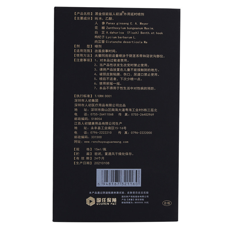 【官方旗舰店】人初油外用延时喷剂黑金装男用夫妻湿巾纸印度神油