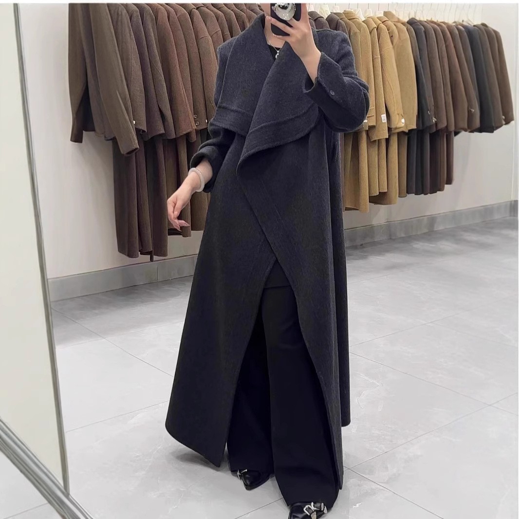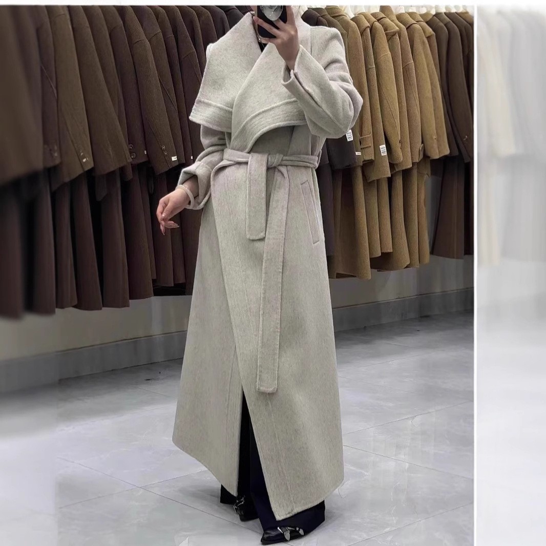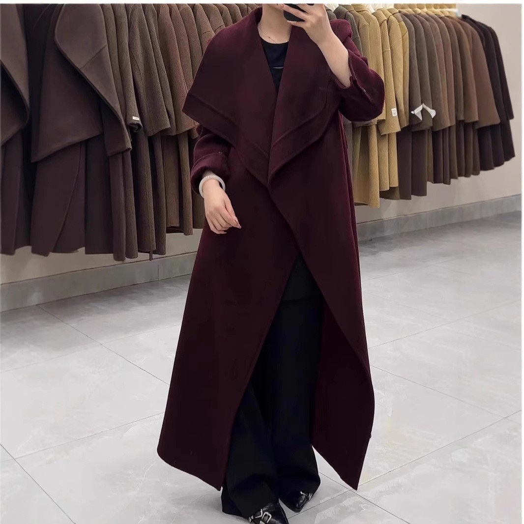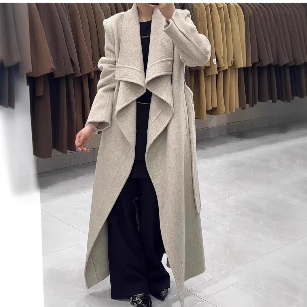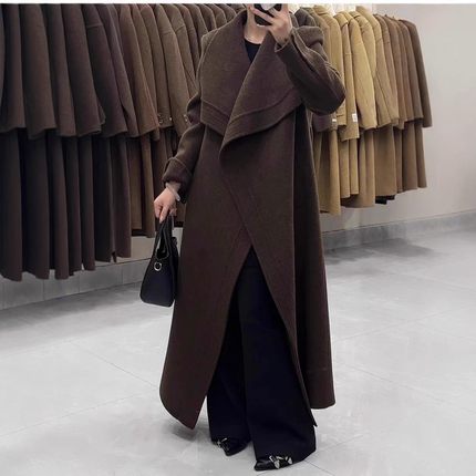 高级秋冬新款2025纹边双面羊毛大衣气质系带宽松长款毛呢外套女装