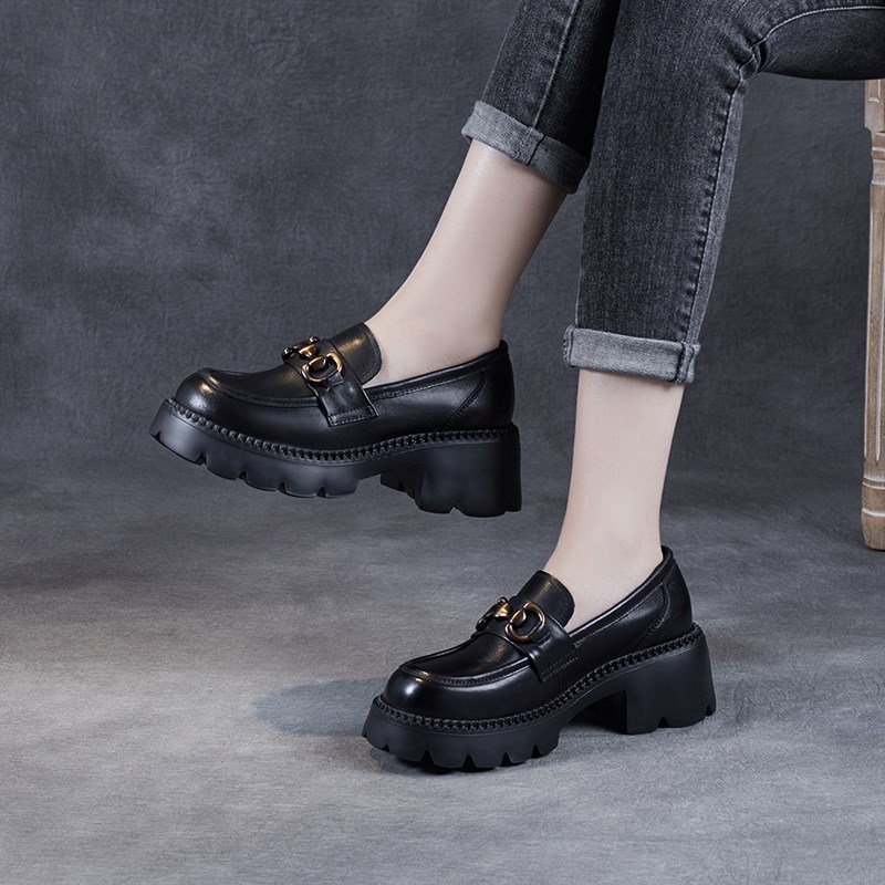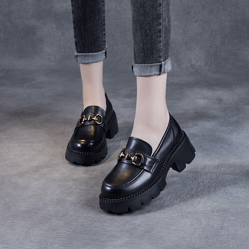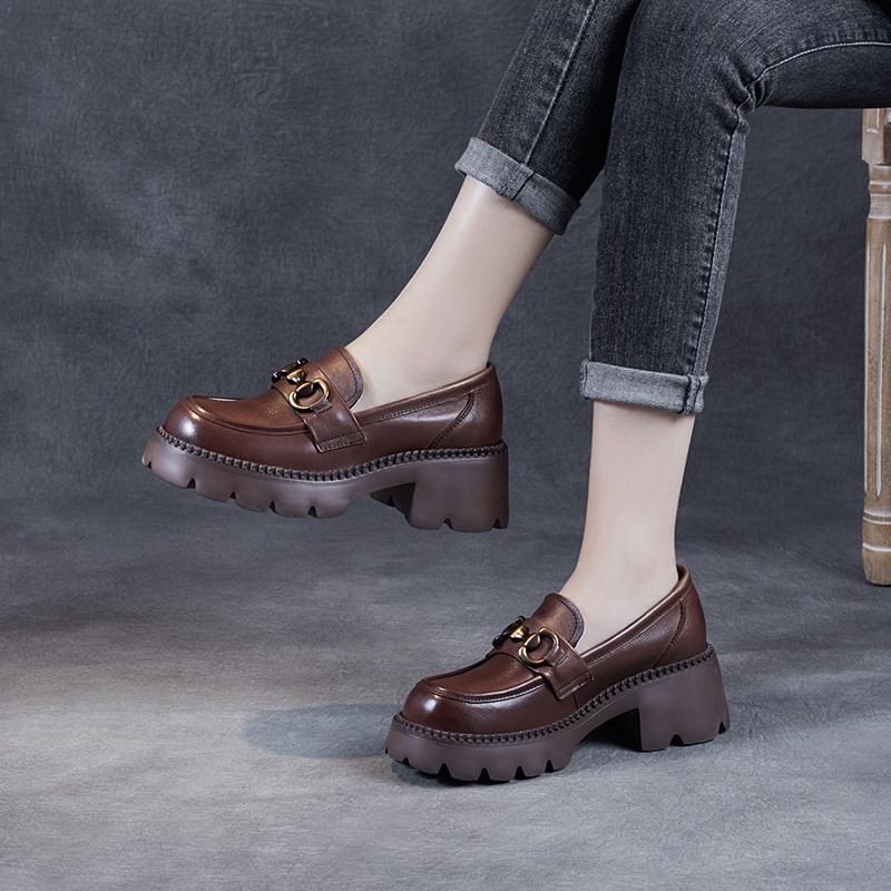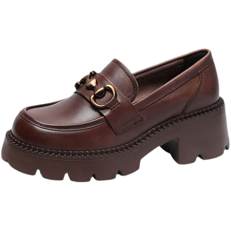 现货速发2025年春新款鞋头层厚底中跟高跟松糕单鞋软皮复古