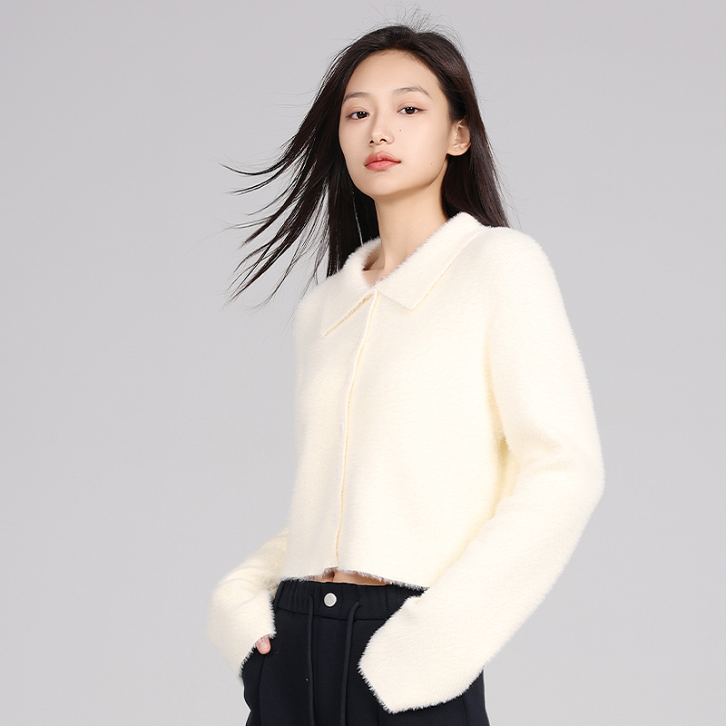 金苑冬季复古可爱翻领毛茸茸纯色百搭短款长袖针织衫开衫H245109