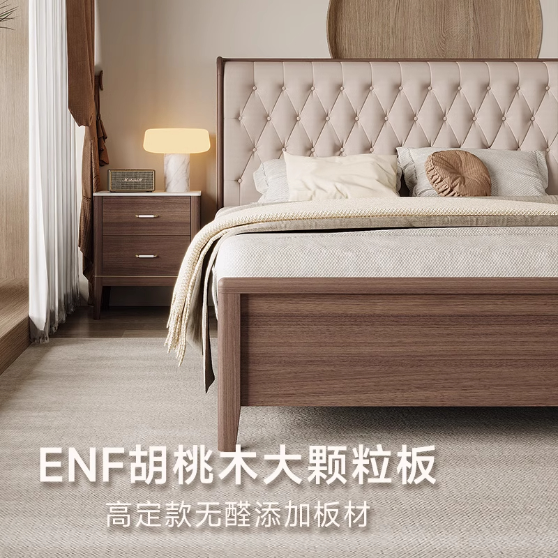 顾家家居实木床美式全实木床胡桃木中古风双人主卧真皮床1.8m大床