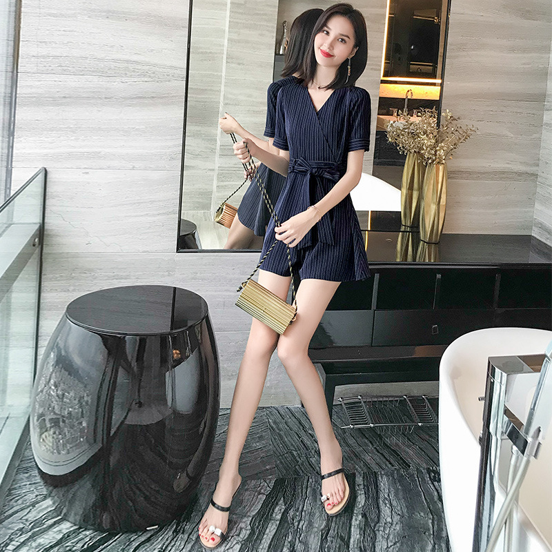 连衣裙女夏连体阔腿裤套装2025新款韩版高腰显瘦修身条纹休闲短裤