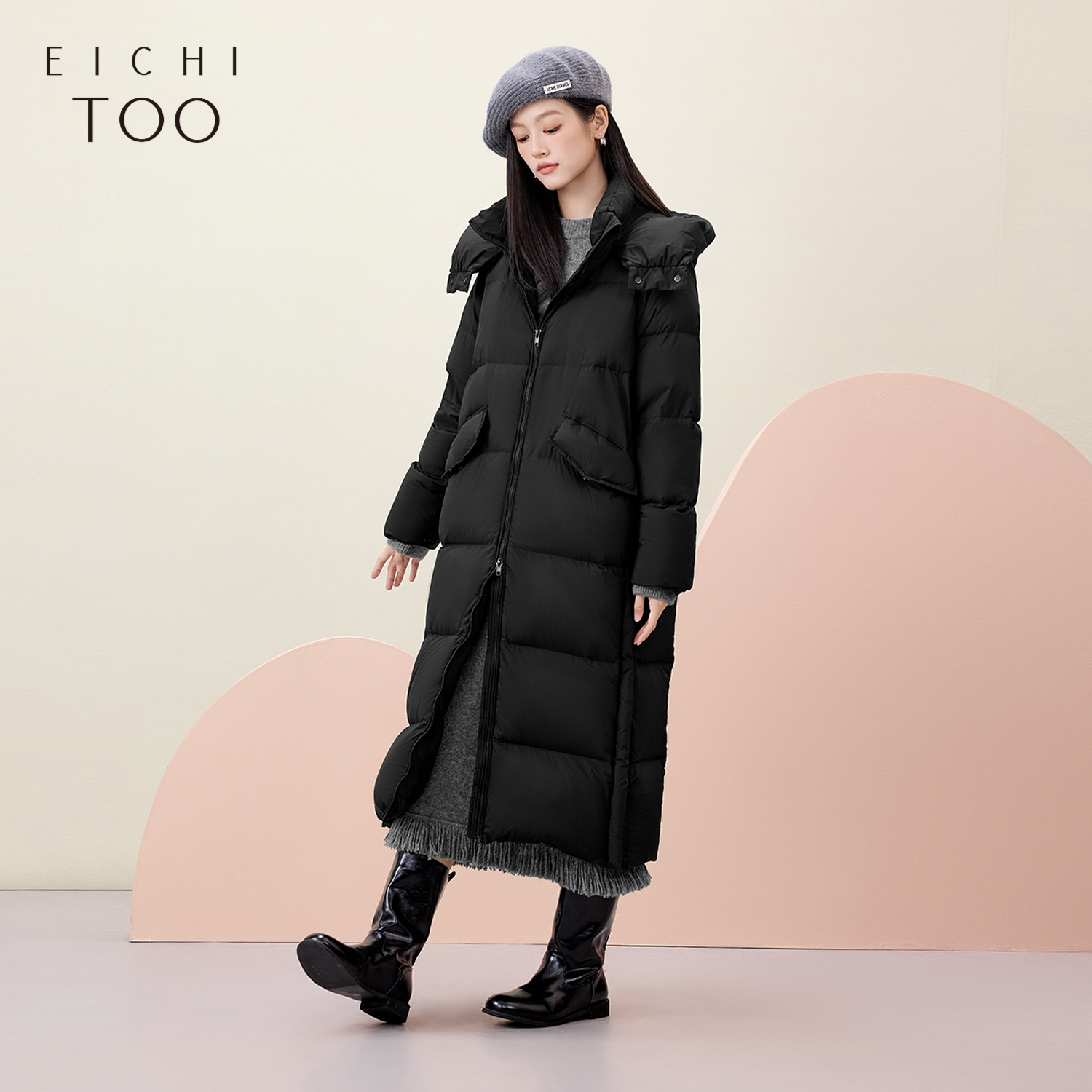 爱居兔长款面包服女爱居兔冬季新款保暖防风黑色连帽羽绒服