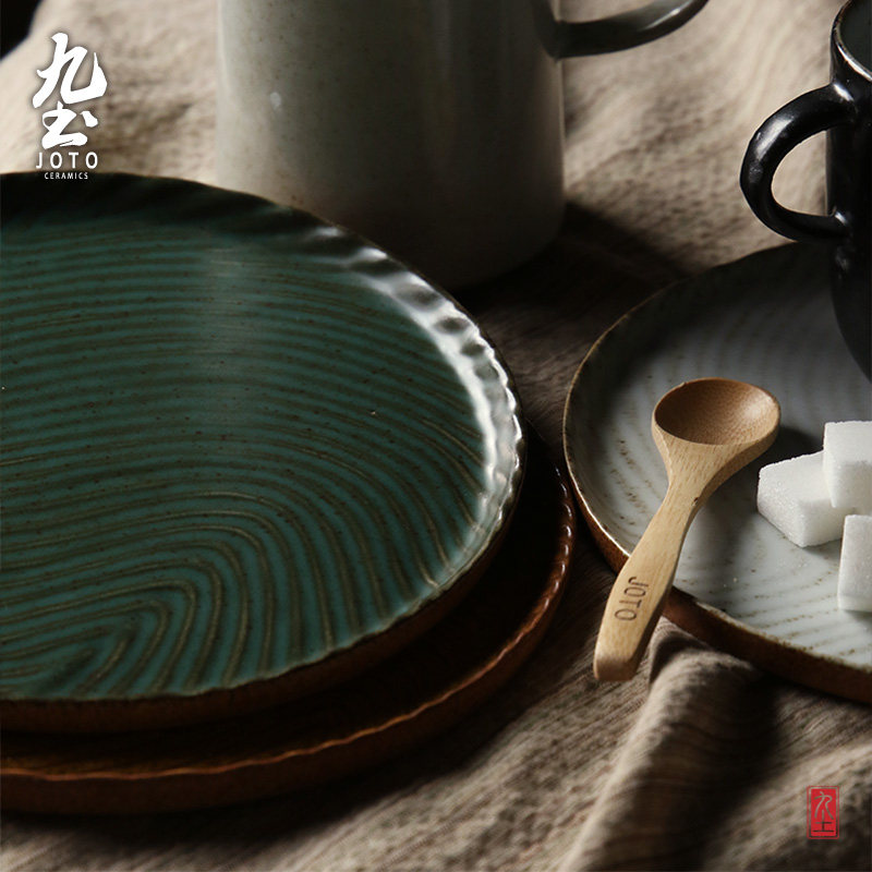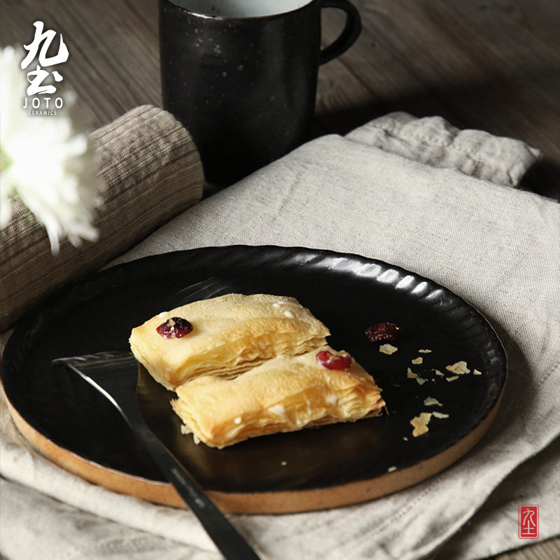 九土日式侘寂粗陶餐具牛排平盘果盘盘子西餐托盘复古圆盘餐盘黑色