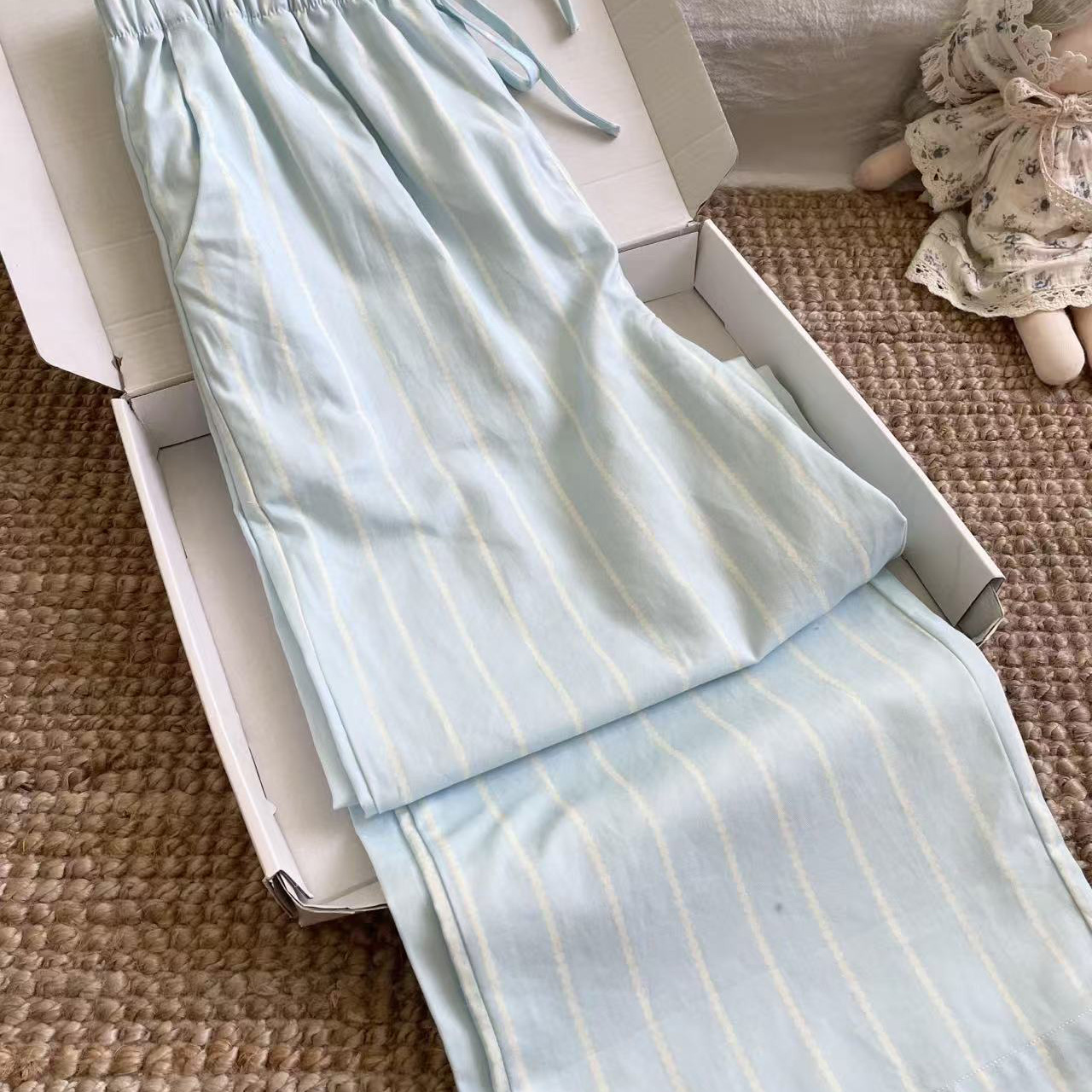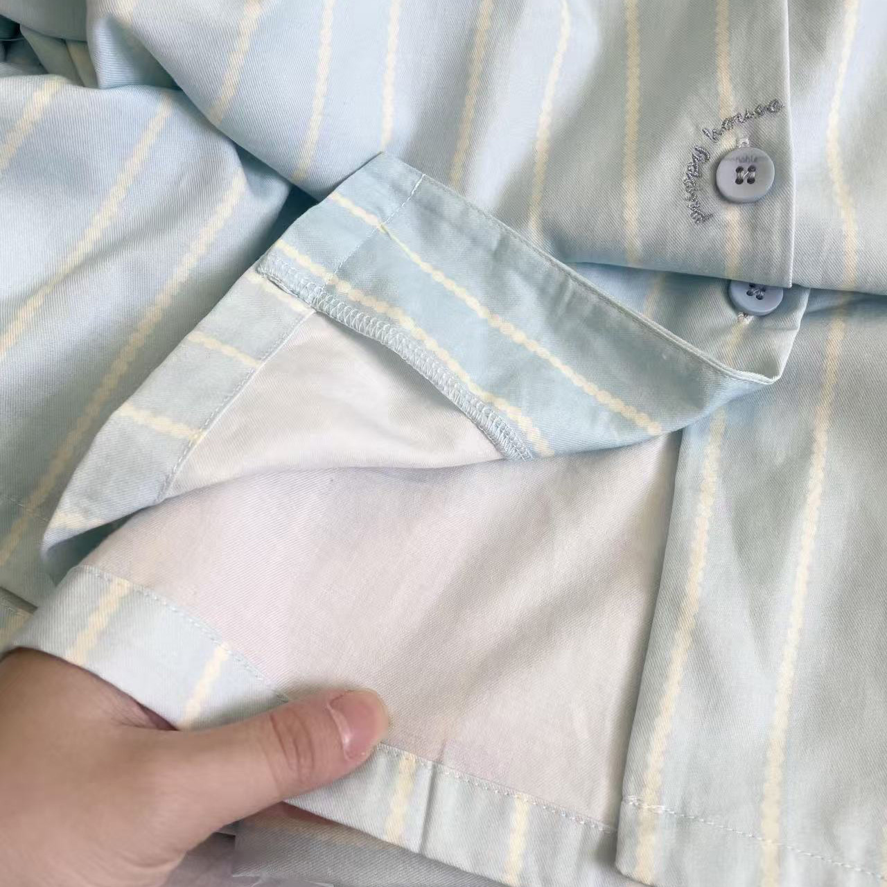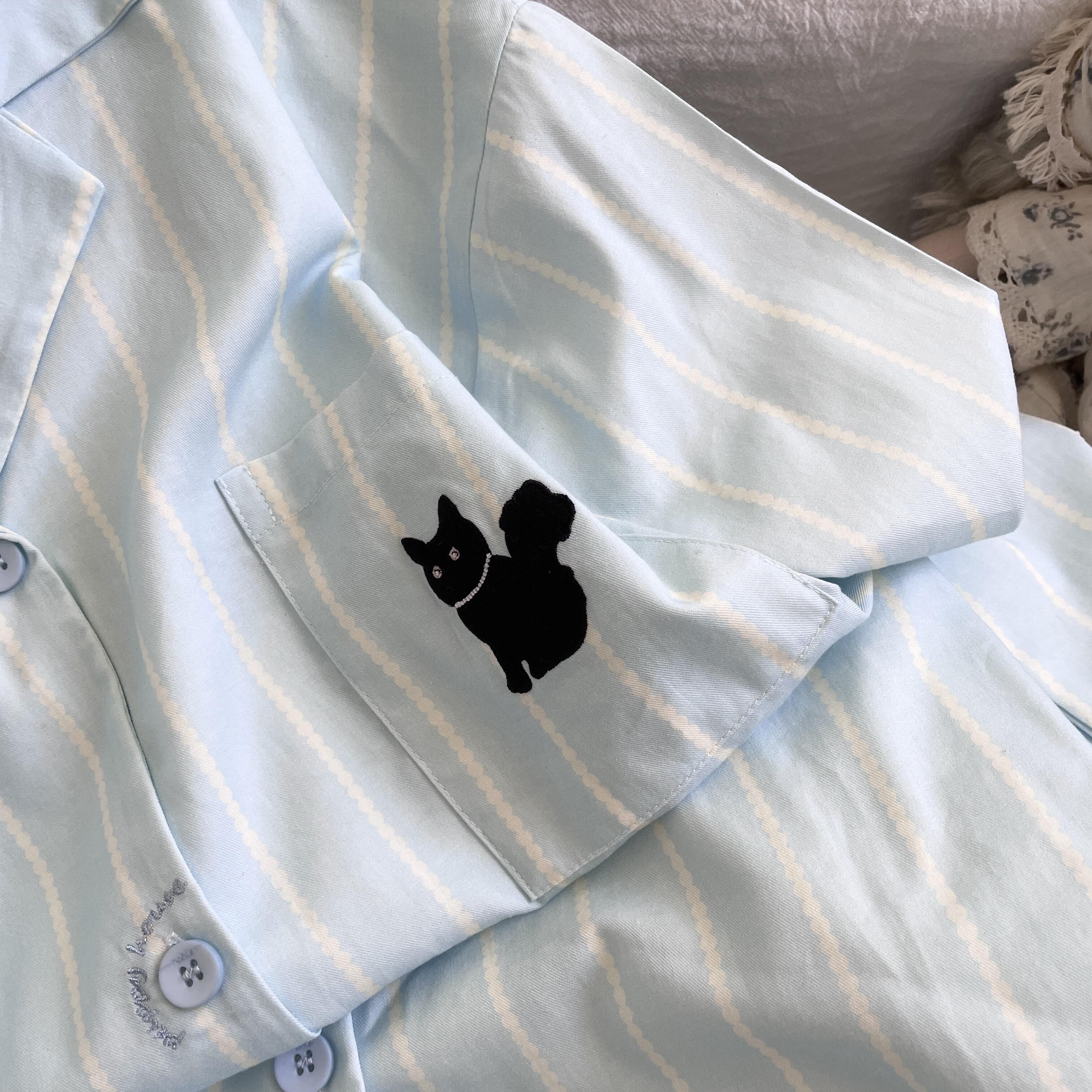侘町2025年春秋季新款蓝条纹小黑猫长袖睡衣套装女卡通休闲家居服