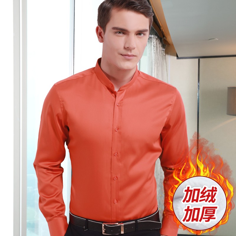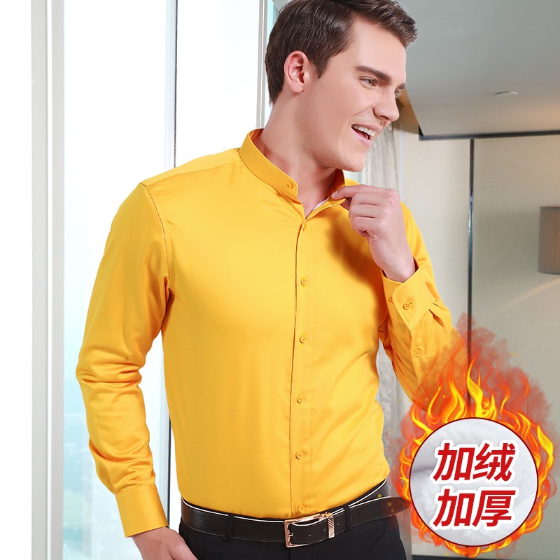 立领衬衫男加绒加厚长袖纯棉白色商务无领圆领中山装男士保暖衬衣