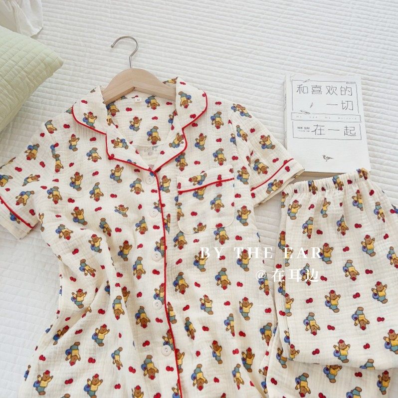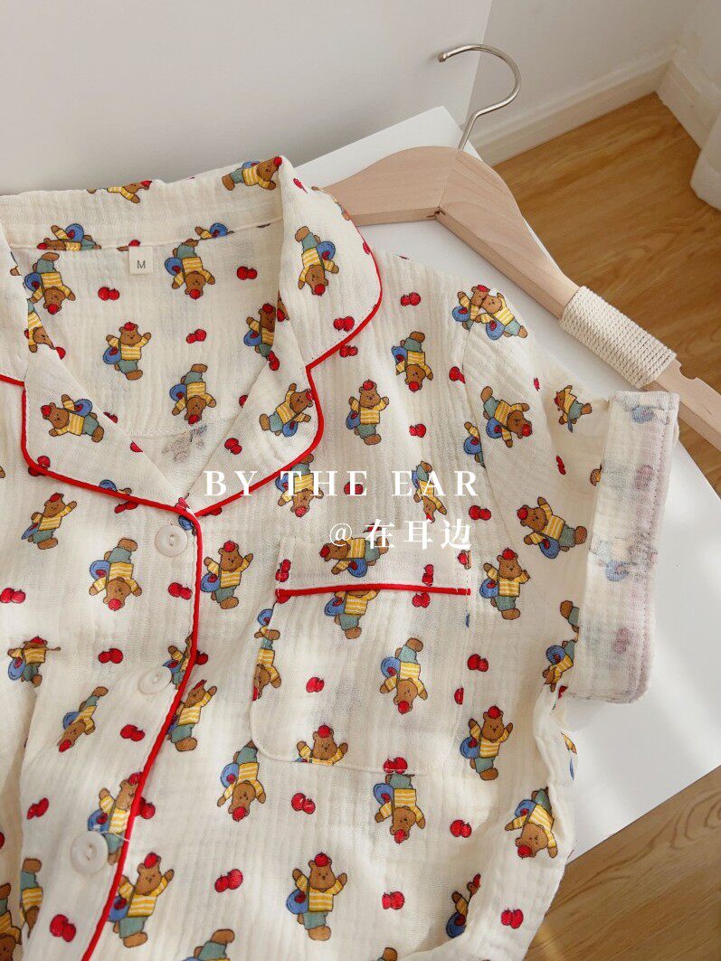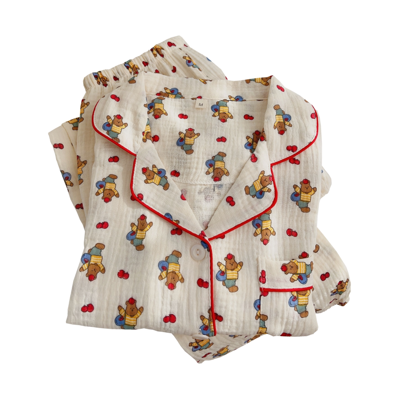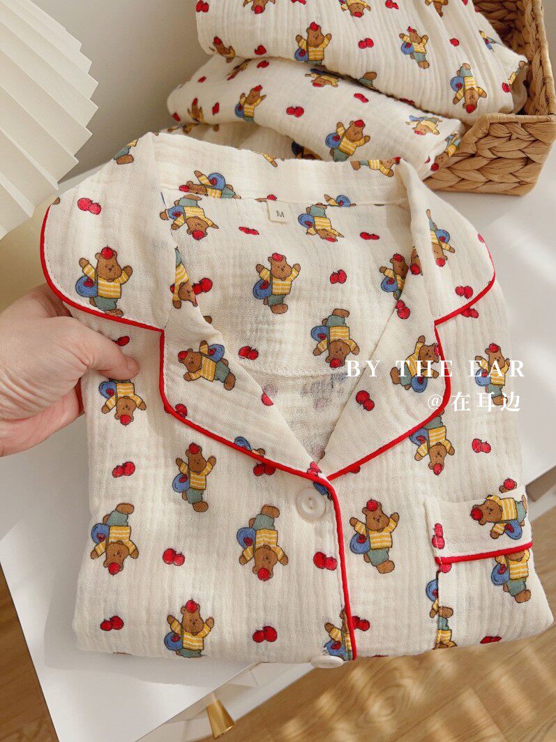 治愈苹果小熊可爱纯棉圆领睡衣女春夏季双层棉纱长袖套头家居服