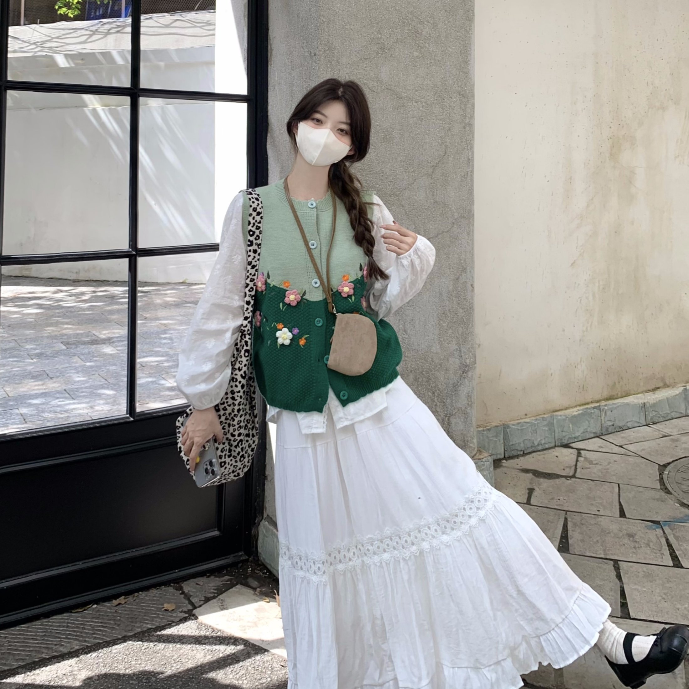~2025手工花朵刺绣针织马甲女拼色毛衣背心刺绣花边衬衫