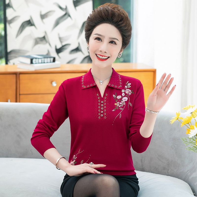 妈妈装春秋新款翻领针织打底衫中老年女洋气绣花毛衣长袖套头小衫