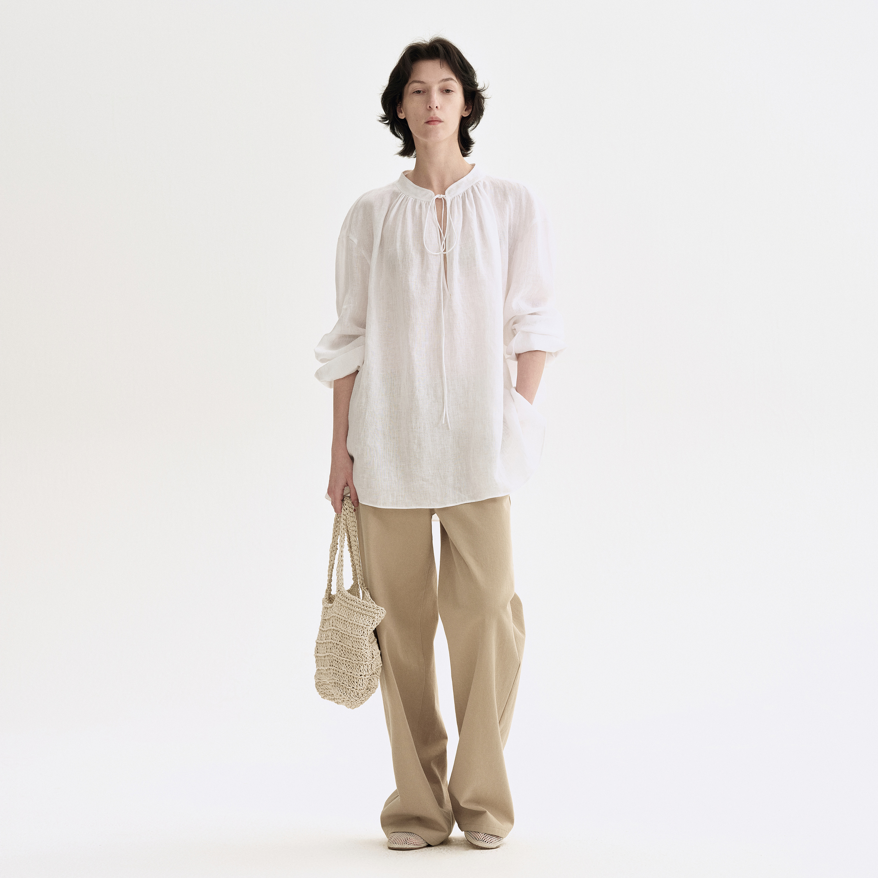 白弓“亚麻系列”夏季新款进口100%亚麻系带长袖衬衫女上衣53722