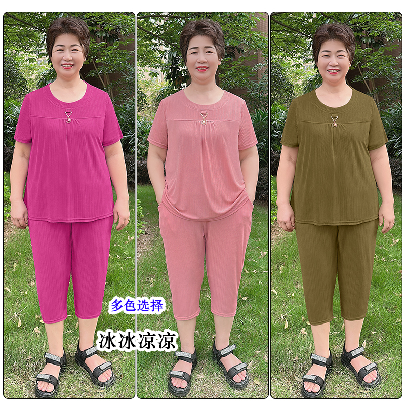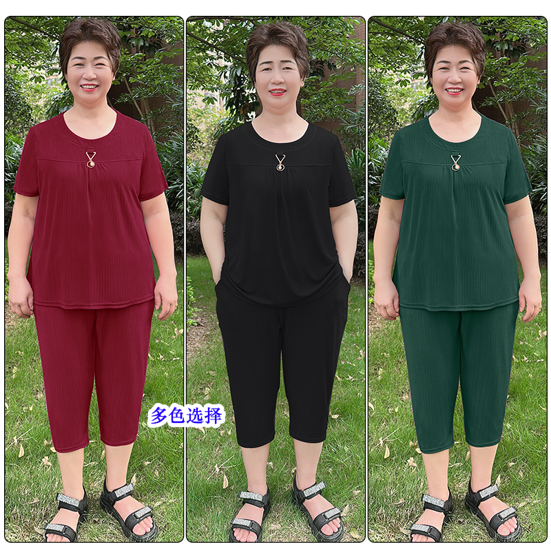 200斤大码妈妈套装中老年夏季女加肥加大短袖T奶奶衫圆领宽松中裤