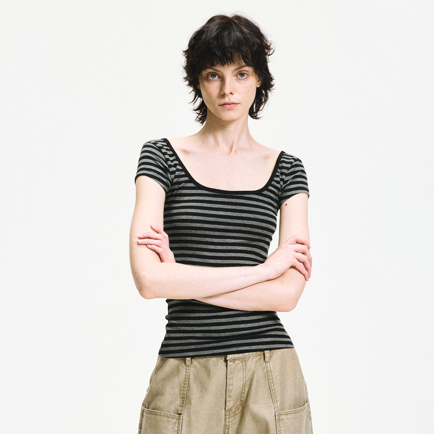 KVKV 黑灰条纹露背镂空正肩短袖上衣 夏季性感辣妹收腰修身t恤女