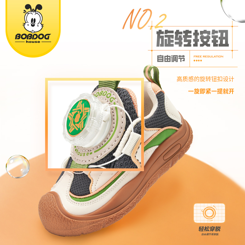 巴布豆童鞋男童纽扣运动鞋2025春秋款儿童网面透气中大童女孩网鞋