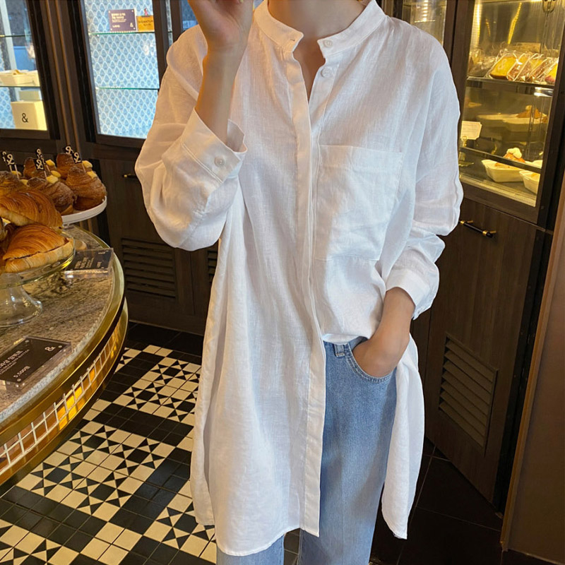法式亚麻白色衬衫女慵懒风宽松长袖防晒衬衣中长款立领棉麻上衣