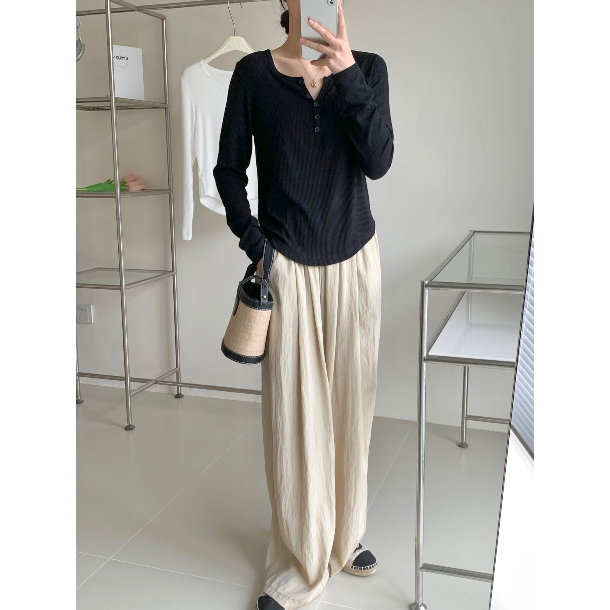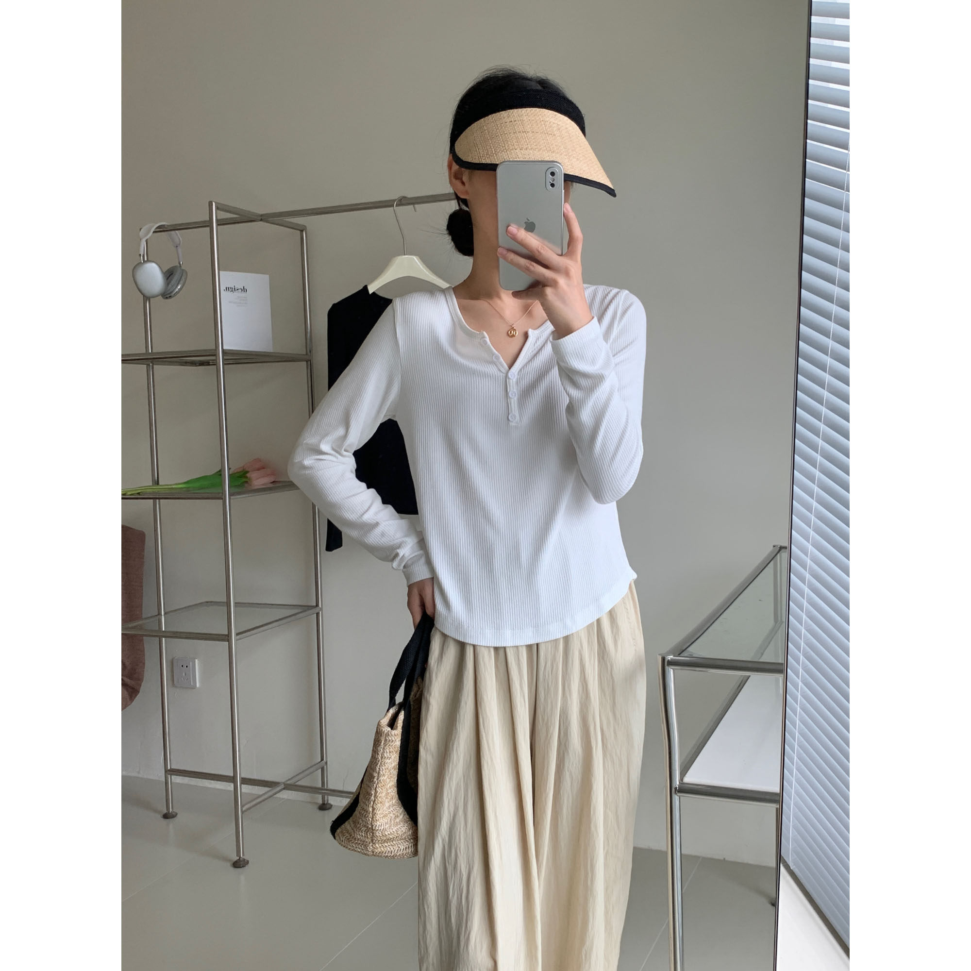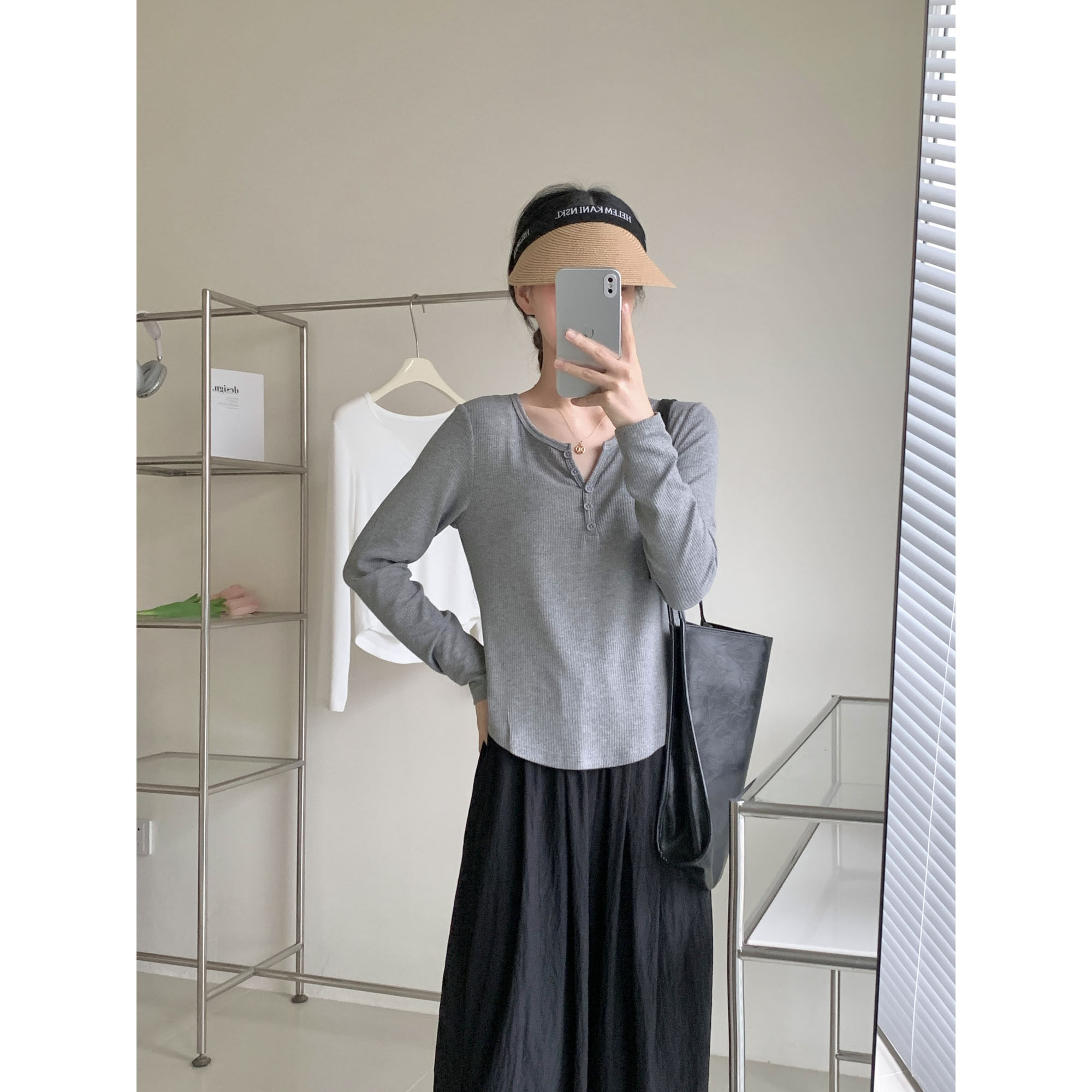 半开领瘦瘦长袖t恤 2023夏末初秋简约薄款显瘦螺纹纯色t恤打底衫