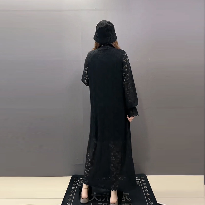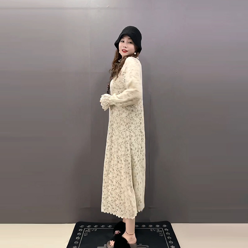胖妹妹过膝长款长袖淑女裙加肥大码女装时尚名媛风显瘦蕾丝连衣裙