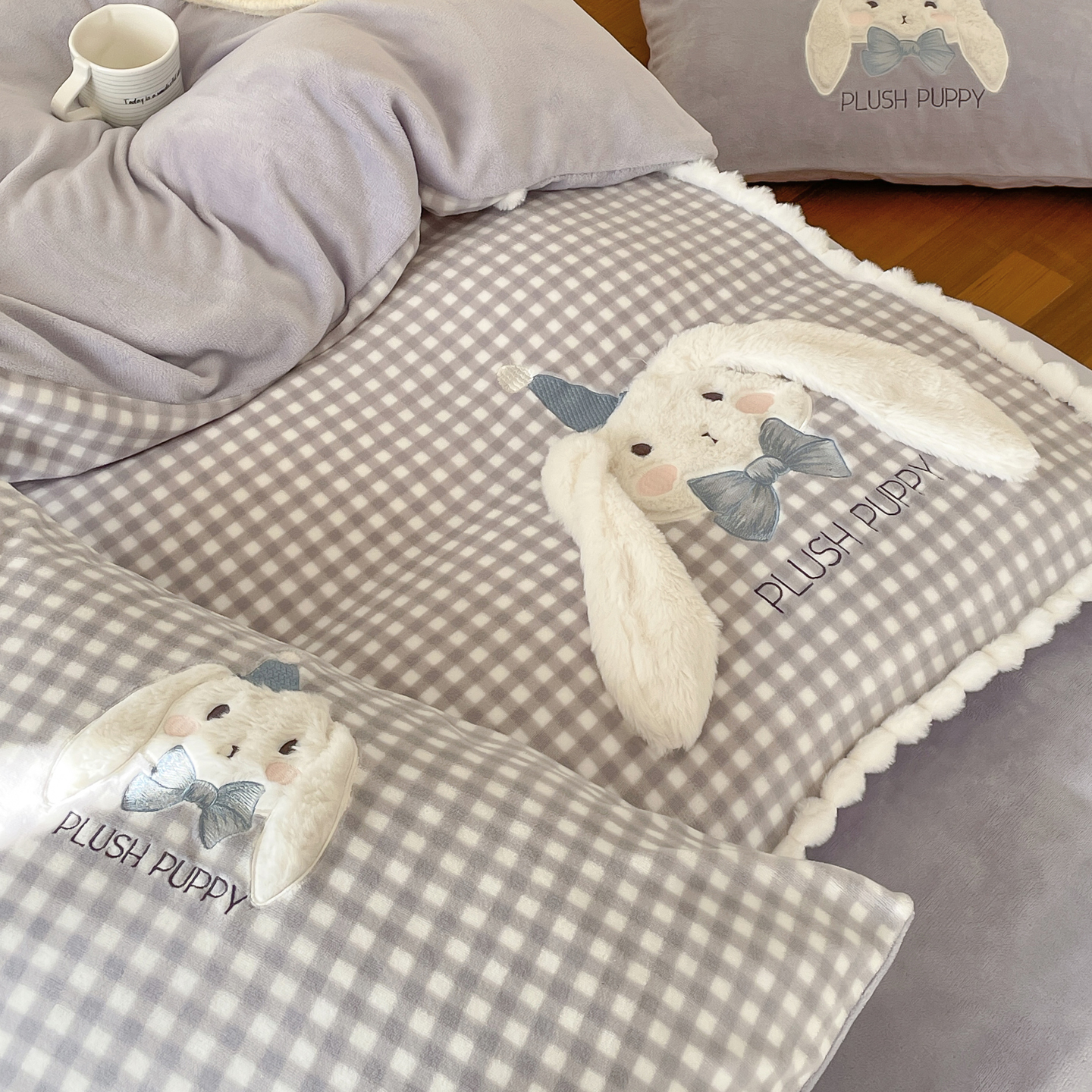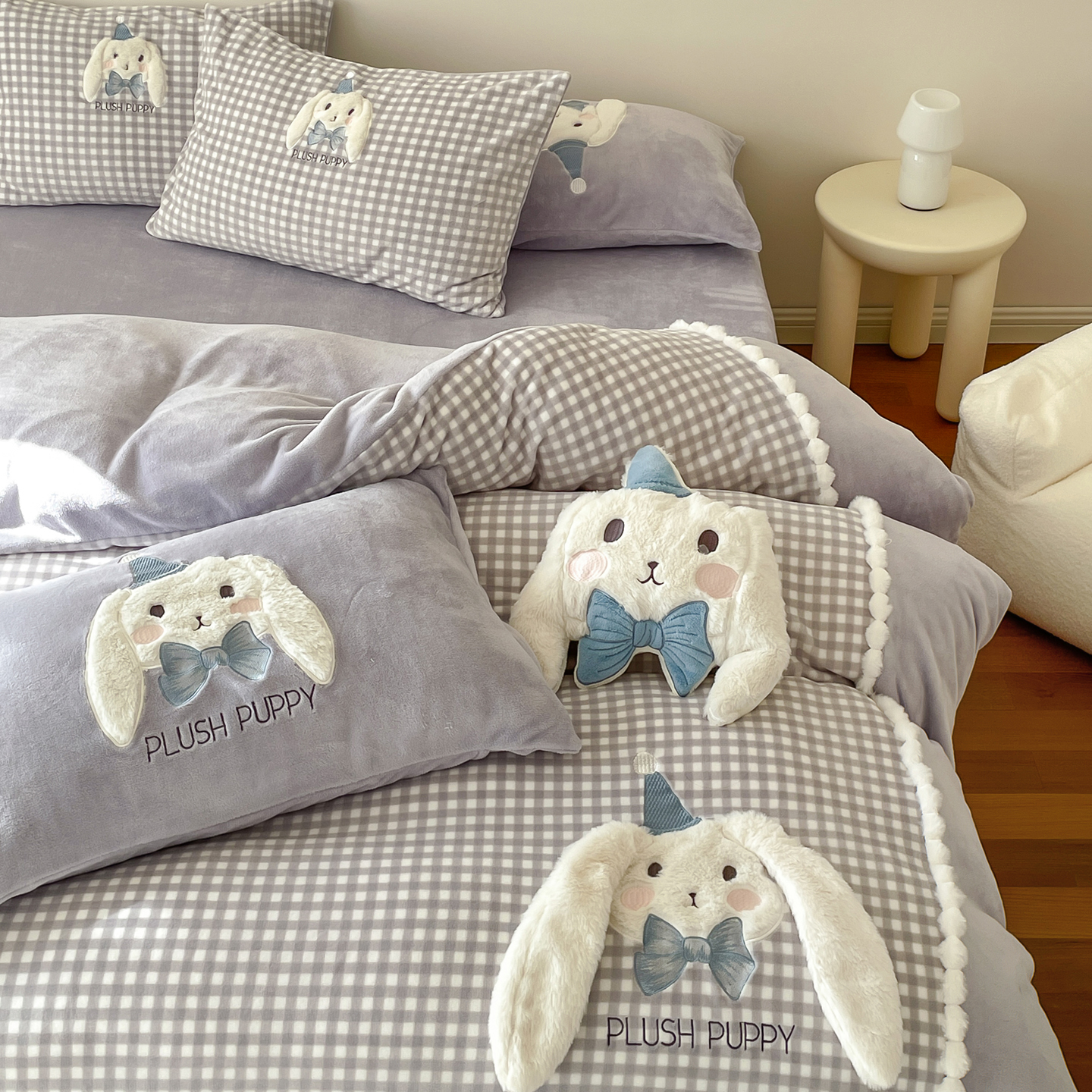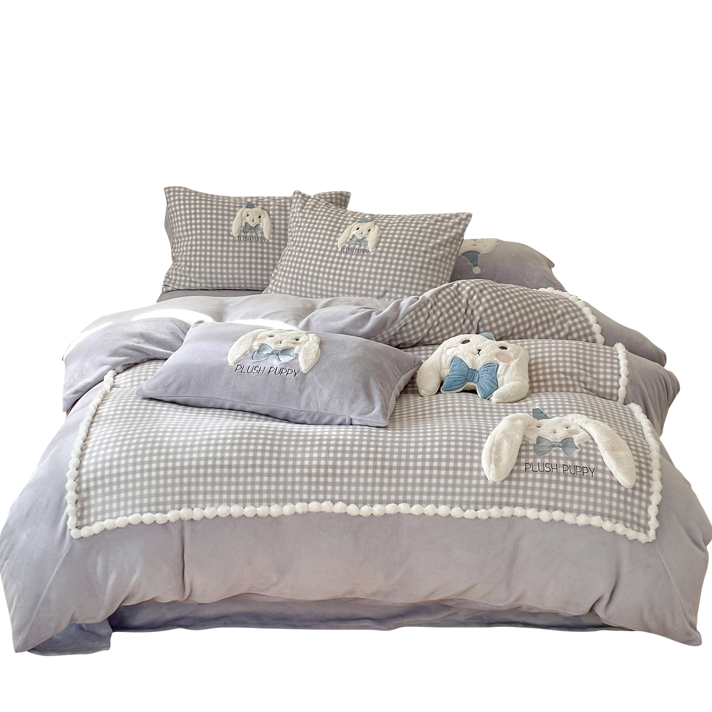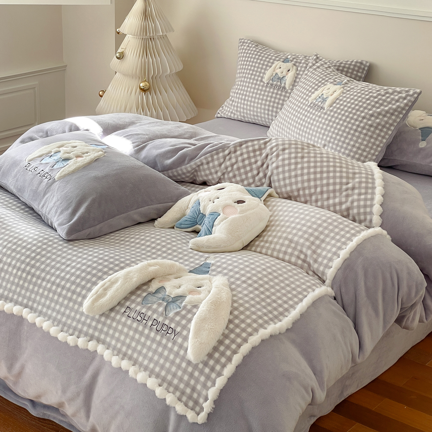 秋冬季保暖牛奶绒四件套立体兔耳朵毛球边被套加绒儿童少女心床品