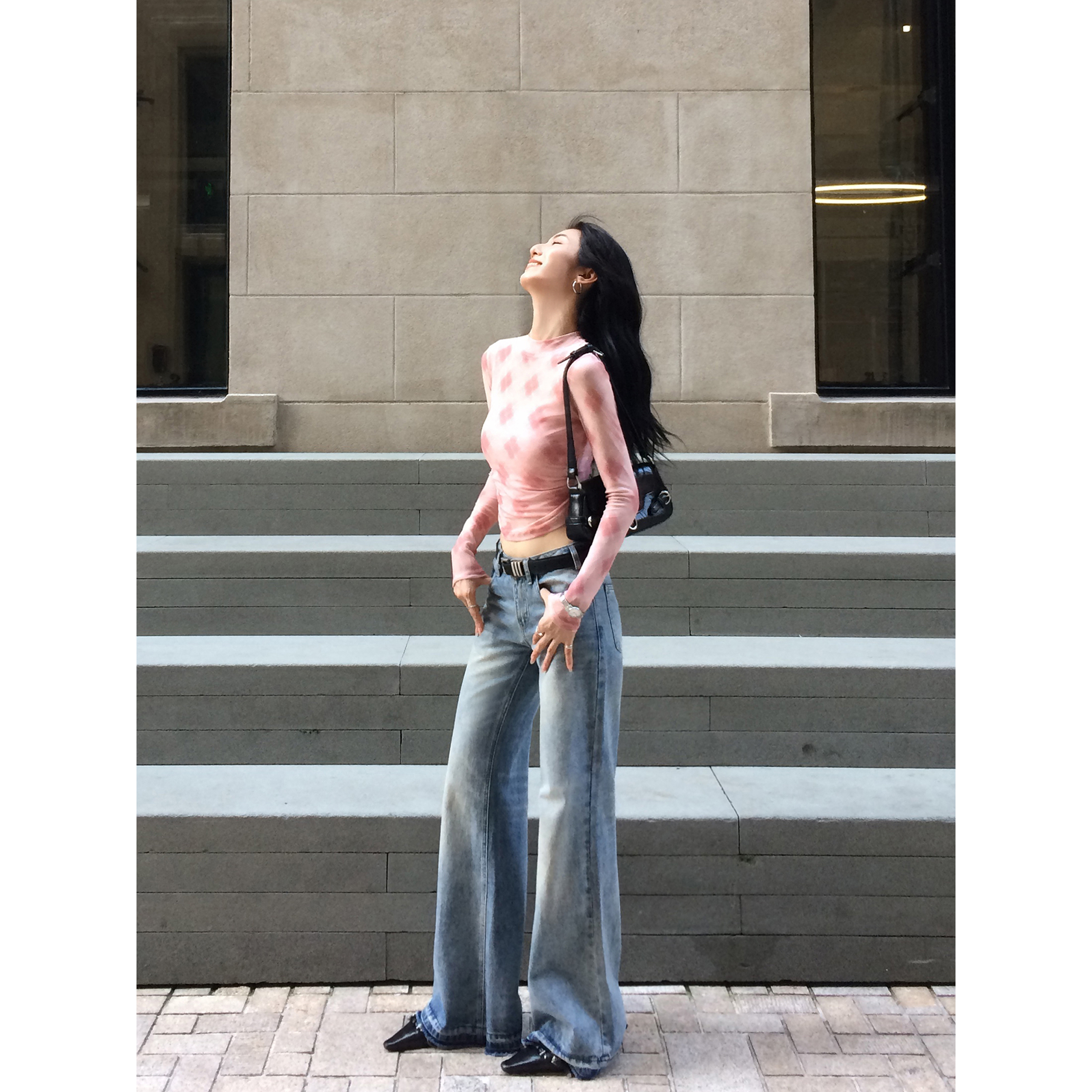 MULVAN 网纱印花长袖t恤女2025春设计感小众高腰短款修身纯欲上衣
