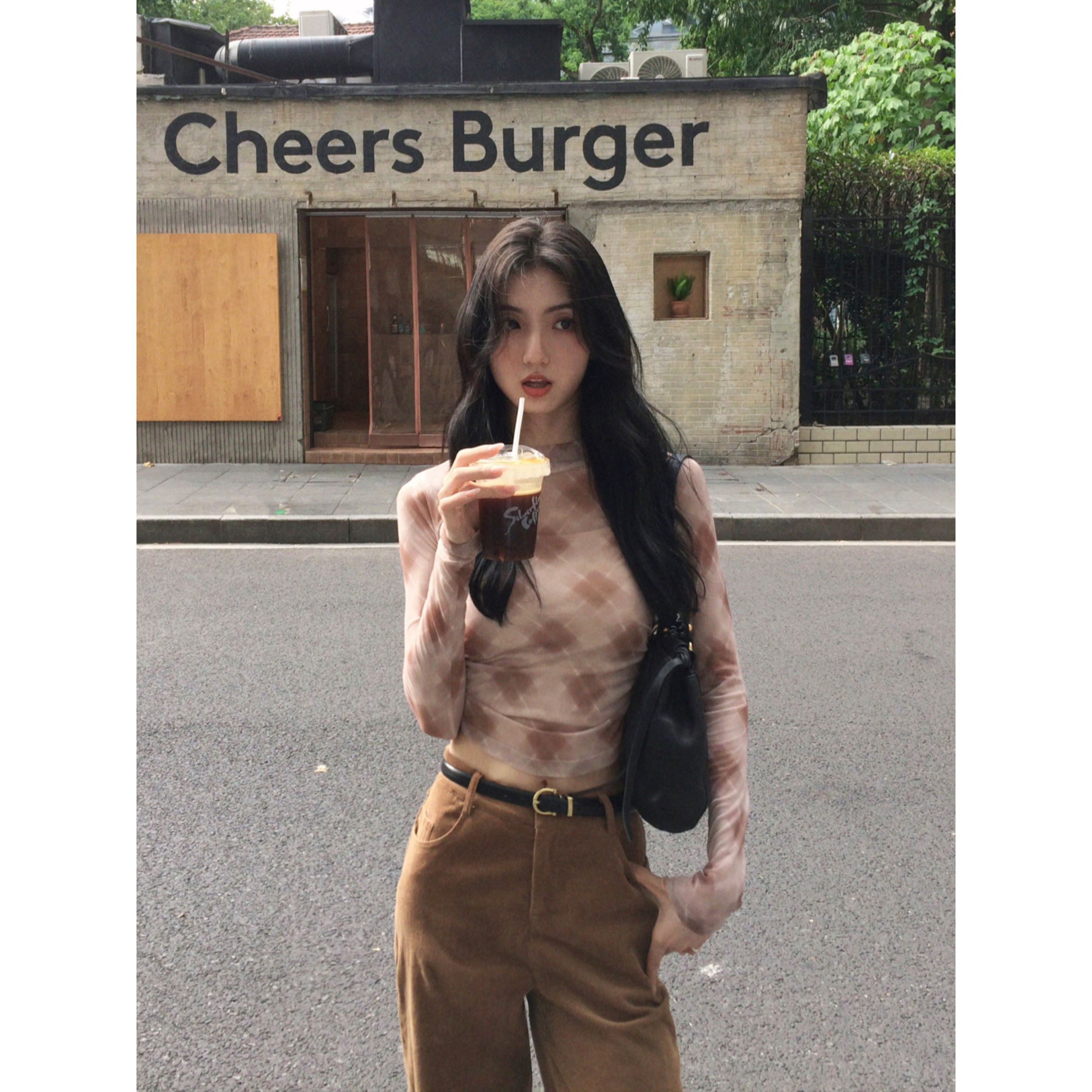 网纱印花长袖t恤女修身纯欲上衣