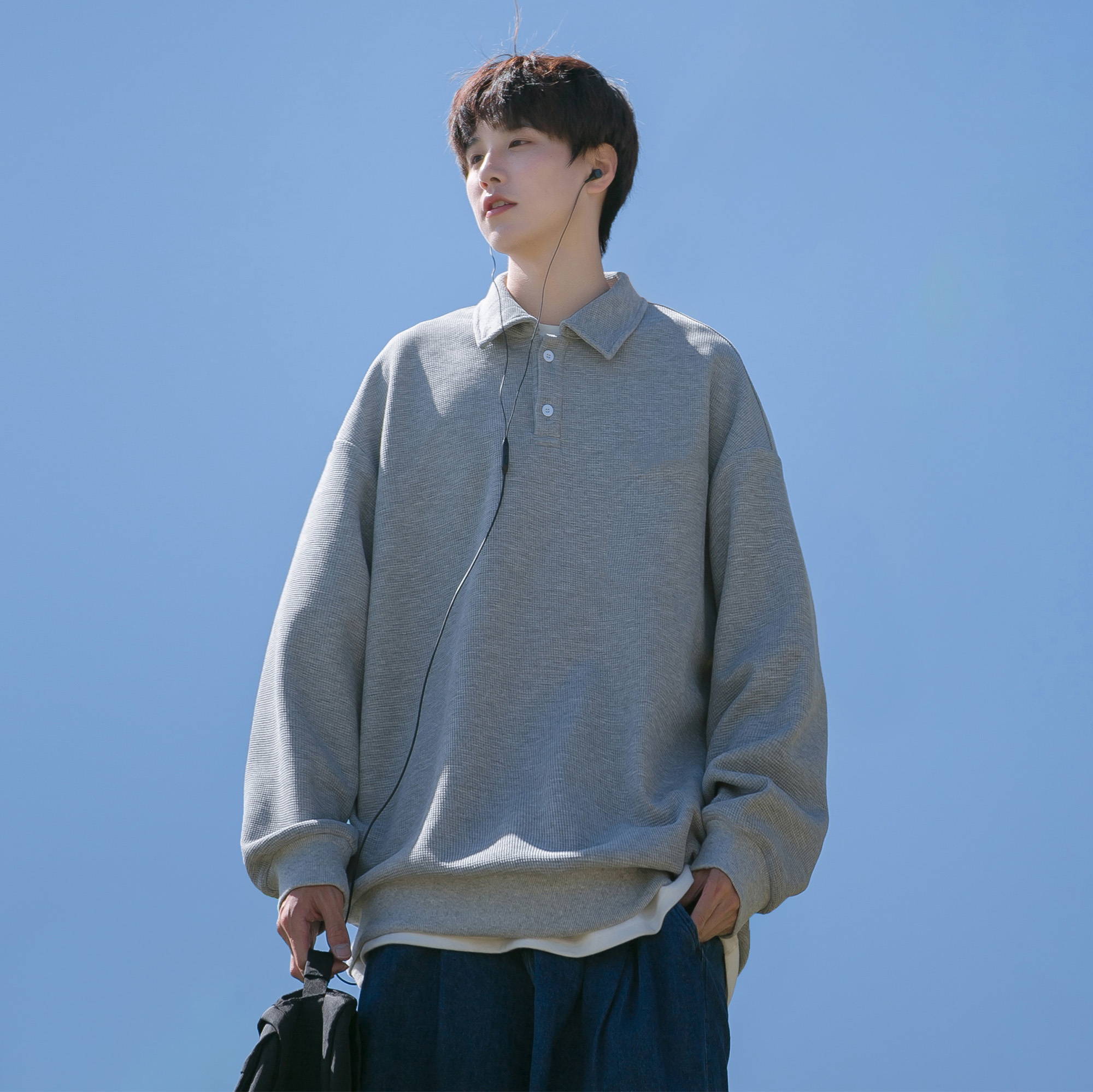 胖胖哥日系复古翻领polo衫男款秋季宽松大码卫衣酷飒百搭长袖上衣