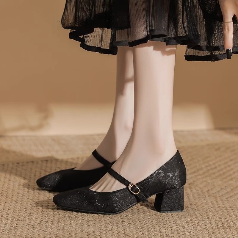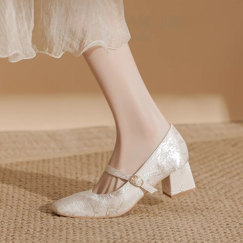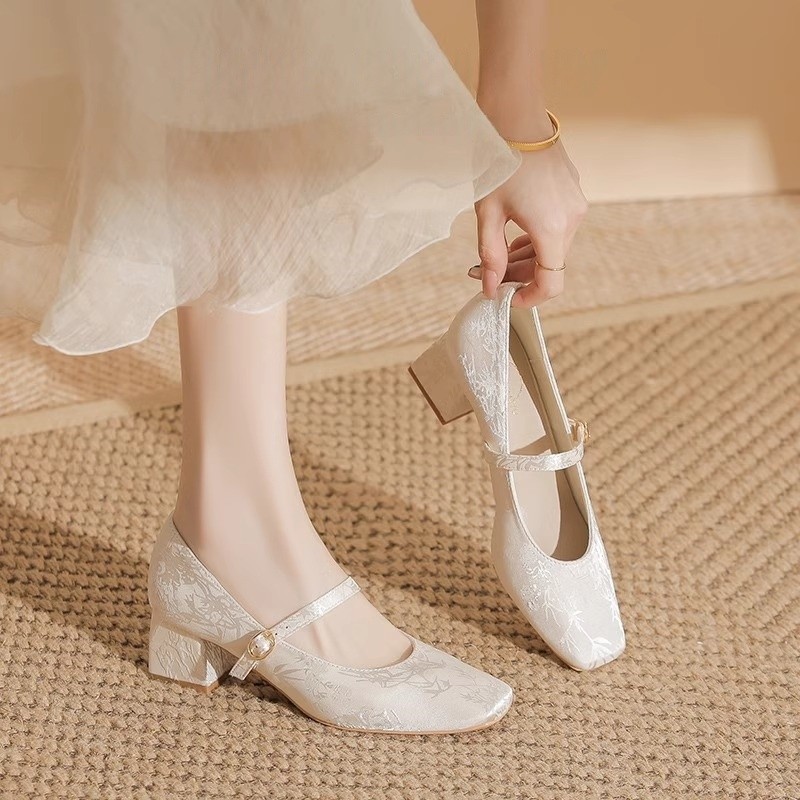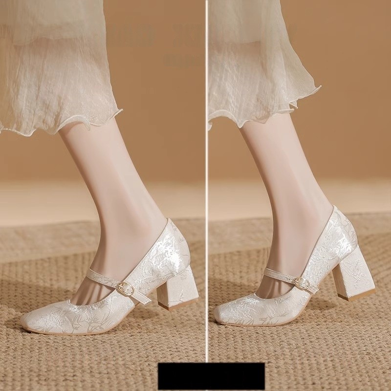 新中式白色粗跟旗袍鞋秀禾婚纱伴娘鞋新娘鞋高跟绸缎单鞋女鞋皮鞋