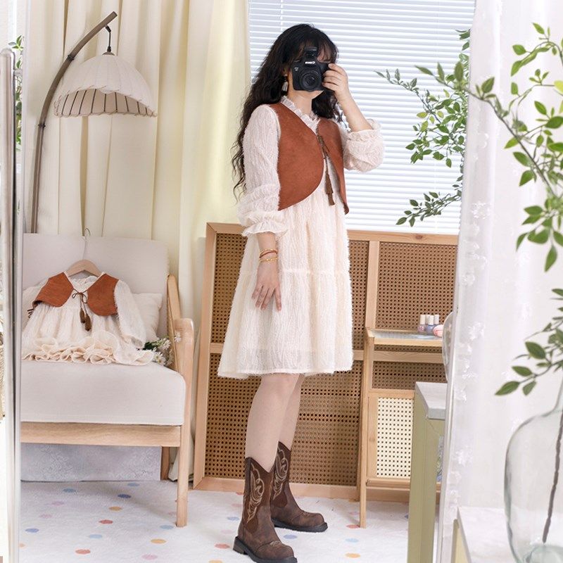 秋装新款亲子装西部流苏马甲旅游拍照母女装大码连衣裙长袖两件套